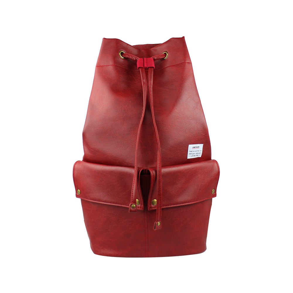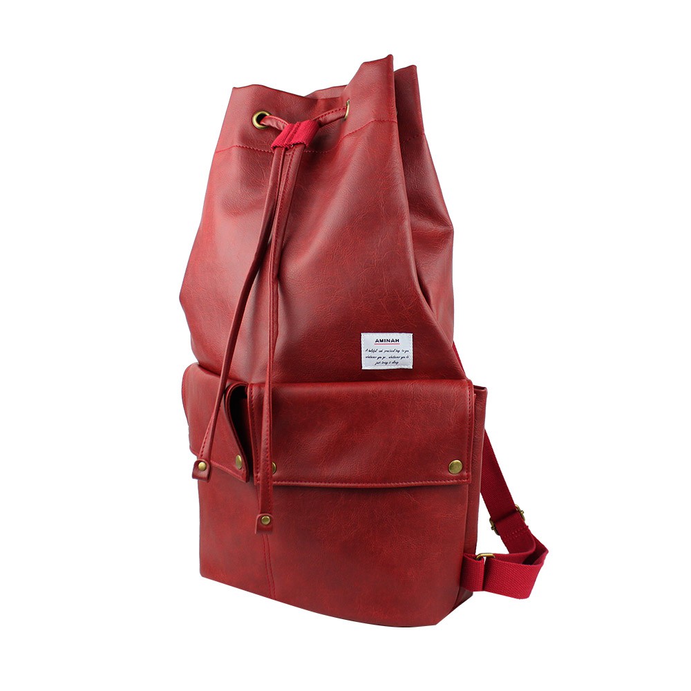 AMINAH 紅色-束口皮革後背包【am-0293】