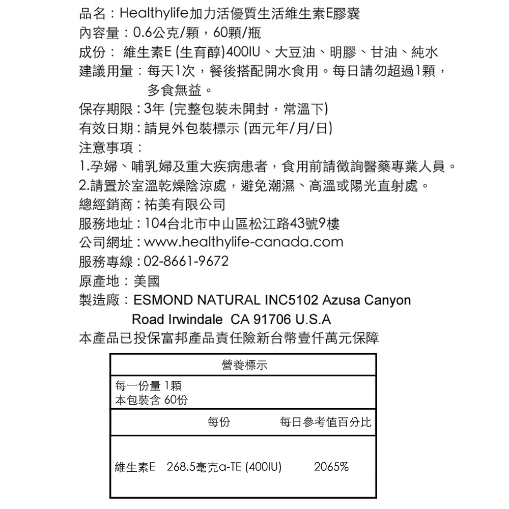 Healthylife 加力活 維生素E膠囊 (60粒/單瓶)【杏一】