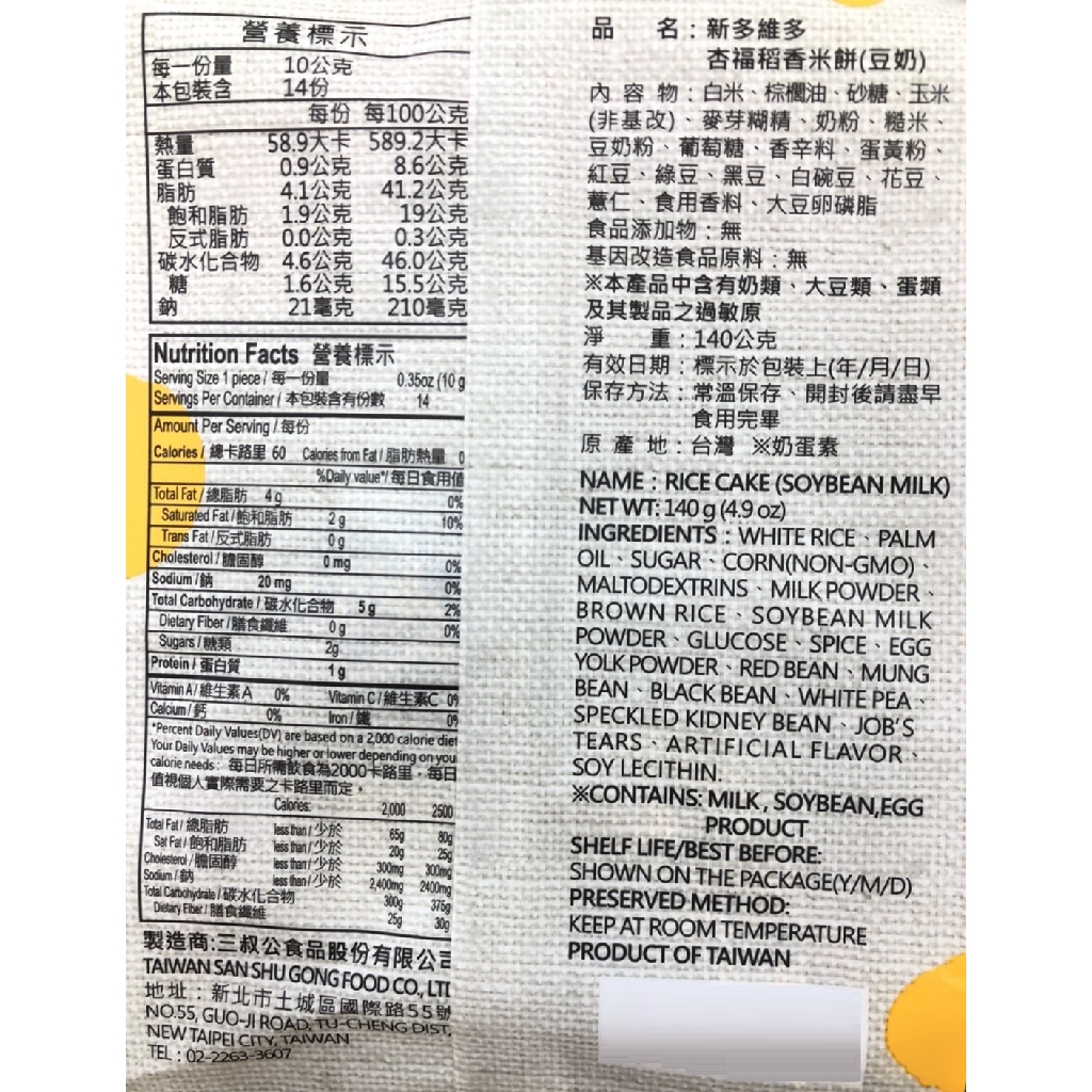 新多維多 杏福稻香米餅-豆奶 (140g/包)【杏一】(超取/店到店最多12包)