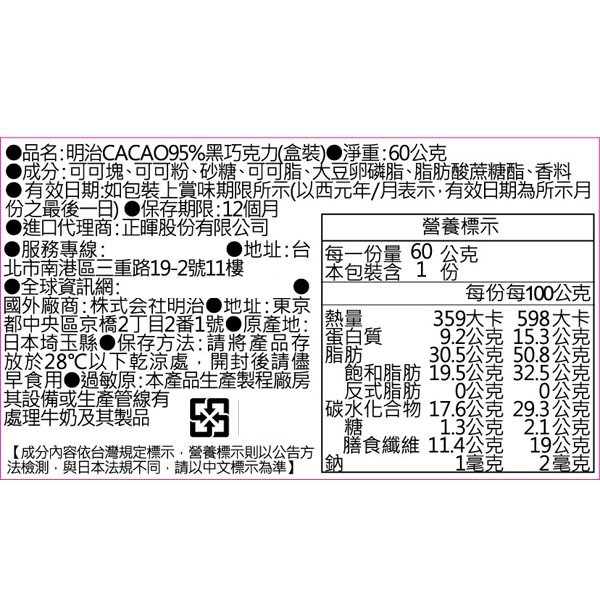 meiji 明治 CACAO 95%黑巧克力 (12枚/盒)【杏一】