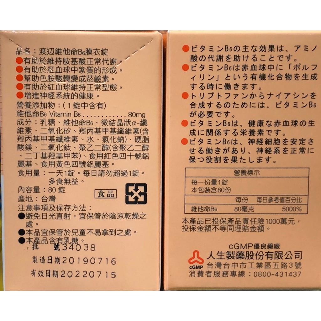 人生製藥 渡邊 維他命B6膜衣錠 (80錠/瓶)【杏一】