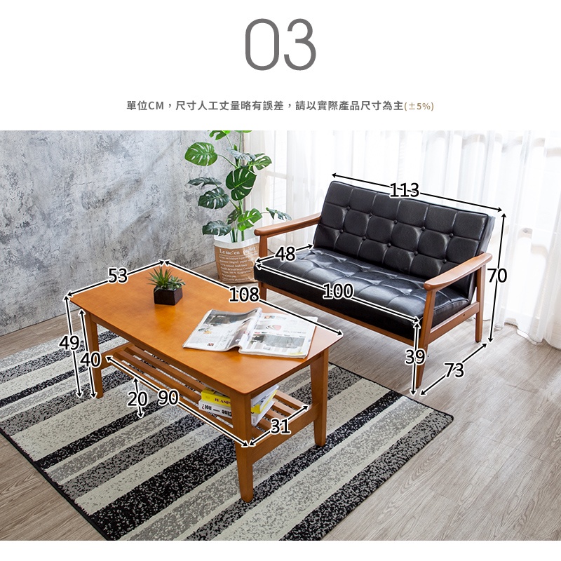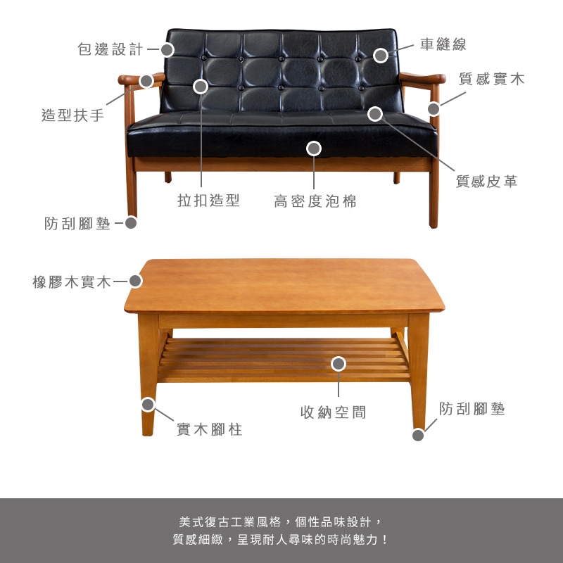 Boden-布蘭頓實木黑色皮沙發客廳組合-二件組(2人+大茶几)