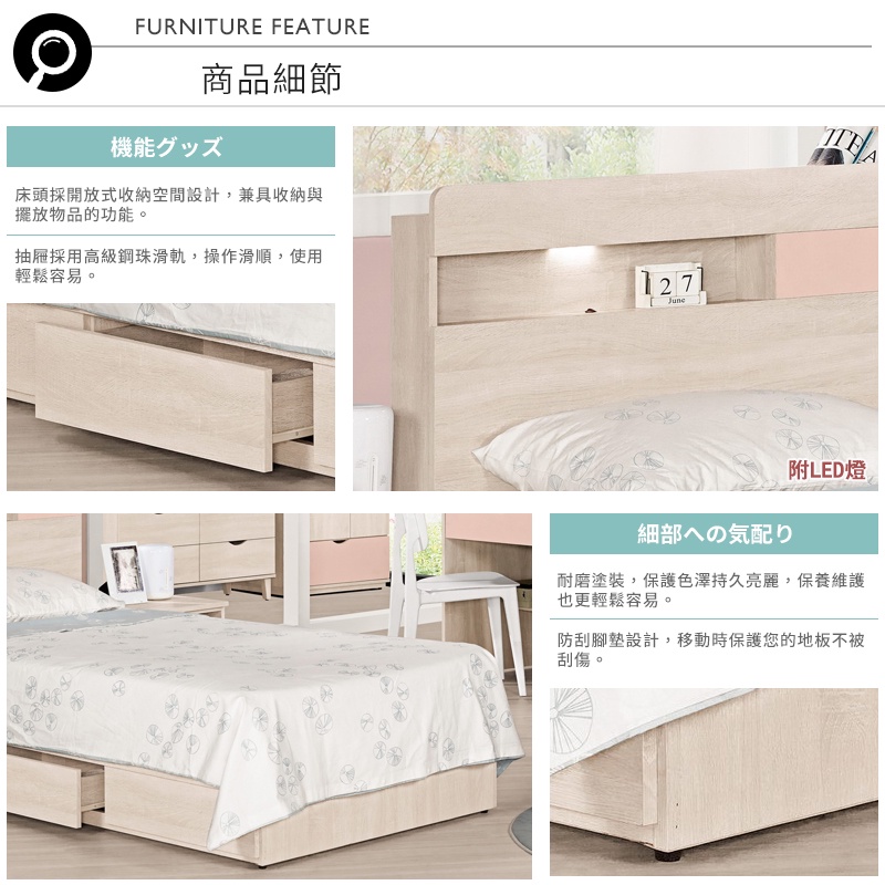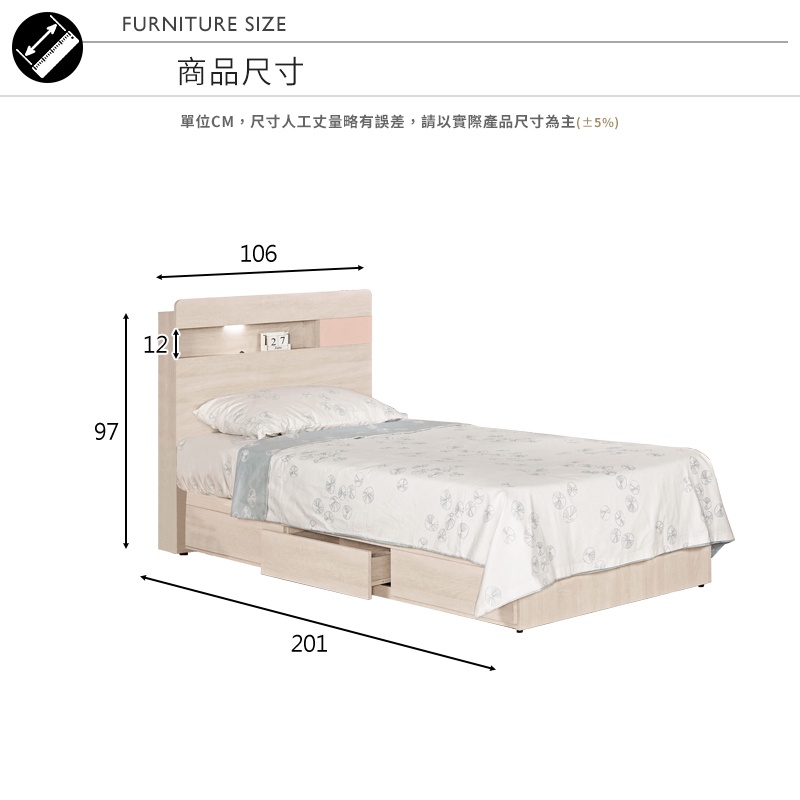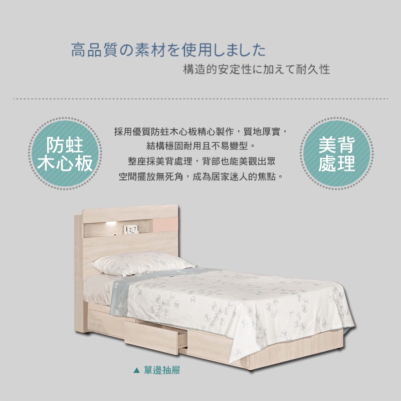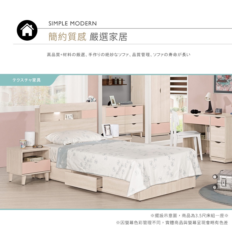 Boden-斯緹3.5尺粉色單人抽屜床組(LED燈床頭片+三抽收納床底-不含床墊)