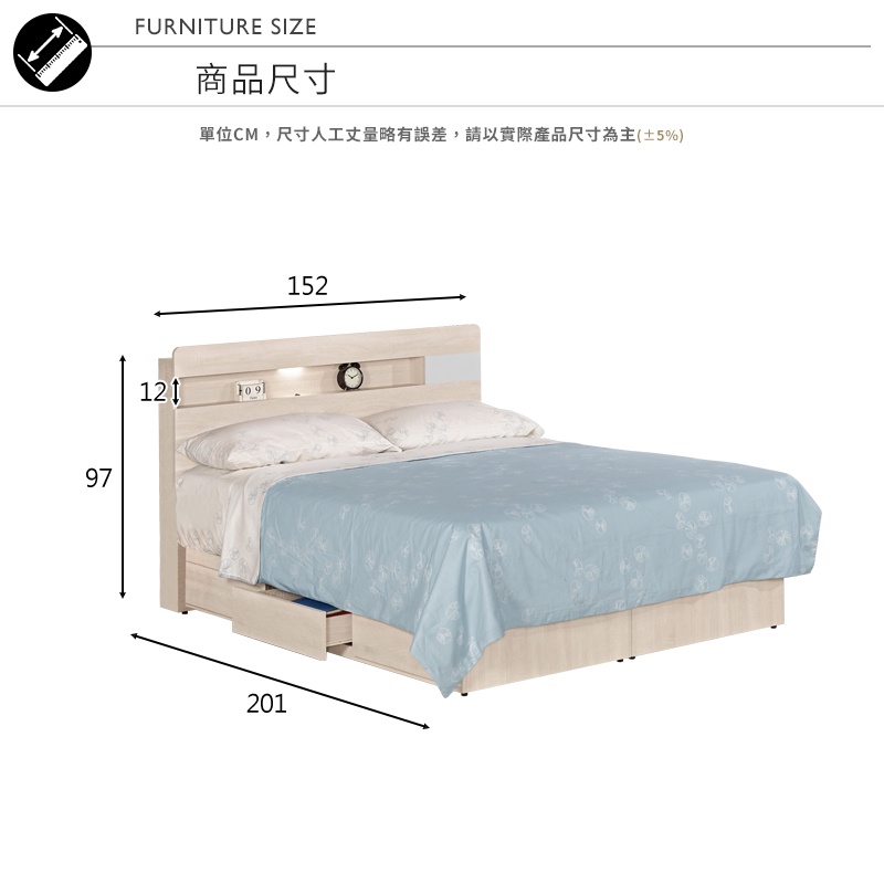 Boden-斯緹5尺藍色雙人抽屜床組(LED燈床頭片+三抽收納床底-不含床墊)