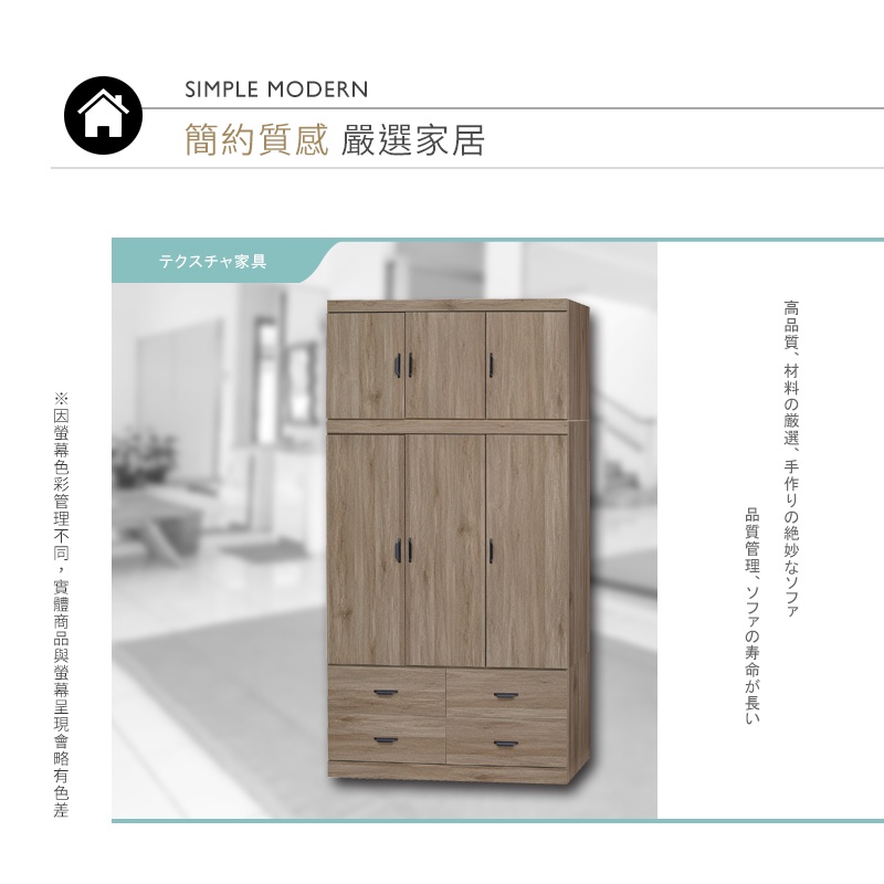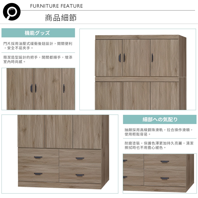 Boden-沃尼4尺三門四抽加高型衣櫃-灰橡色(衣櫃+棉被櫃)