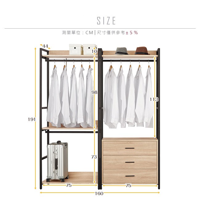 Boden-裴拉5.3尺開放式組合衣櫃(雙吊+三抽)