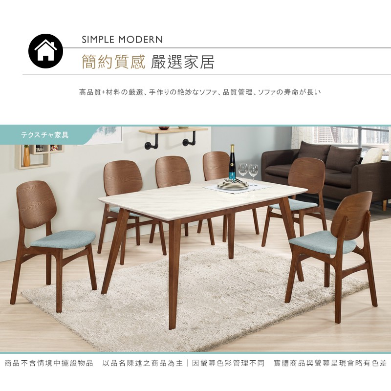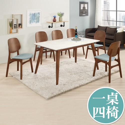 Boden-溫克5尺胡桃色石面餐桌椅組合(一桌四椅)(藍色布餐椅)