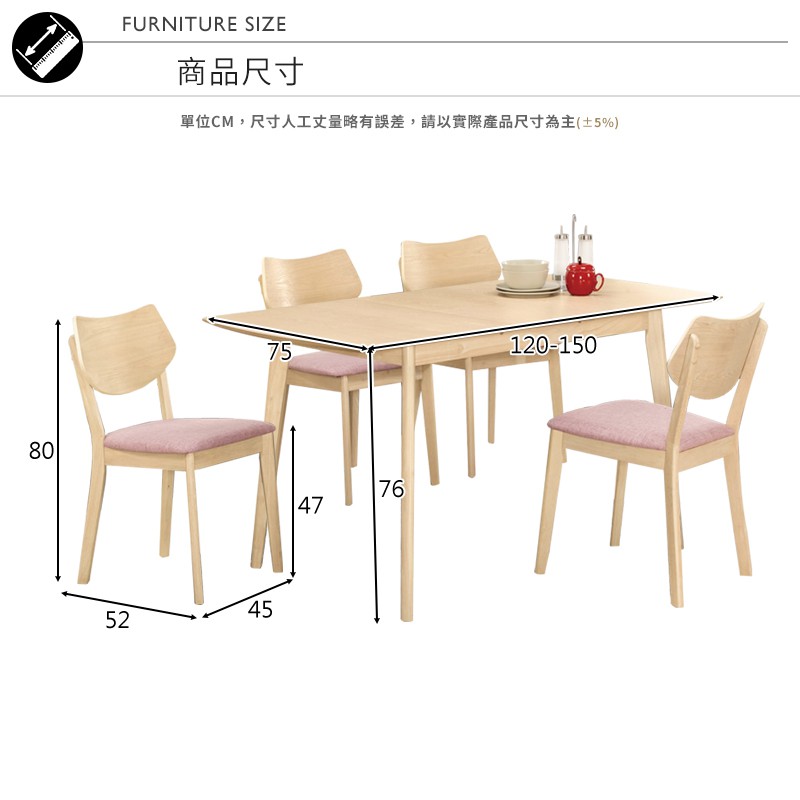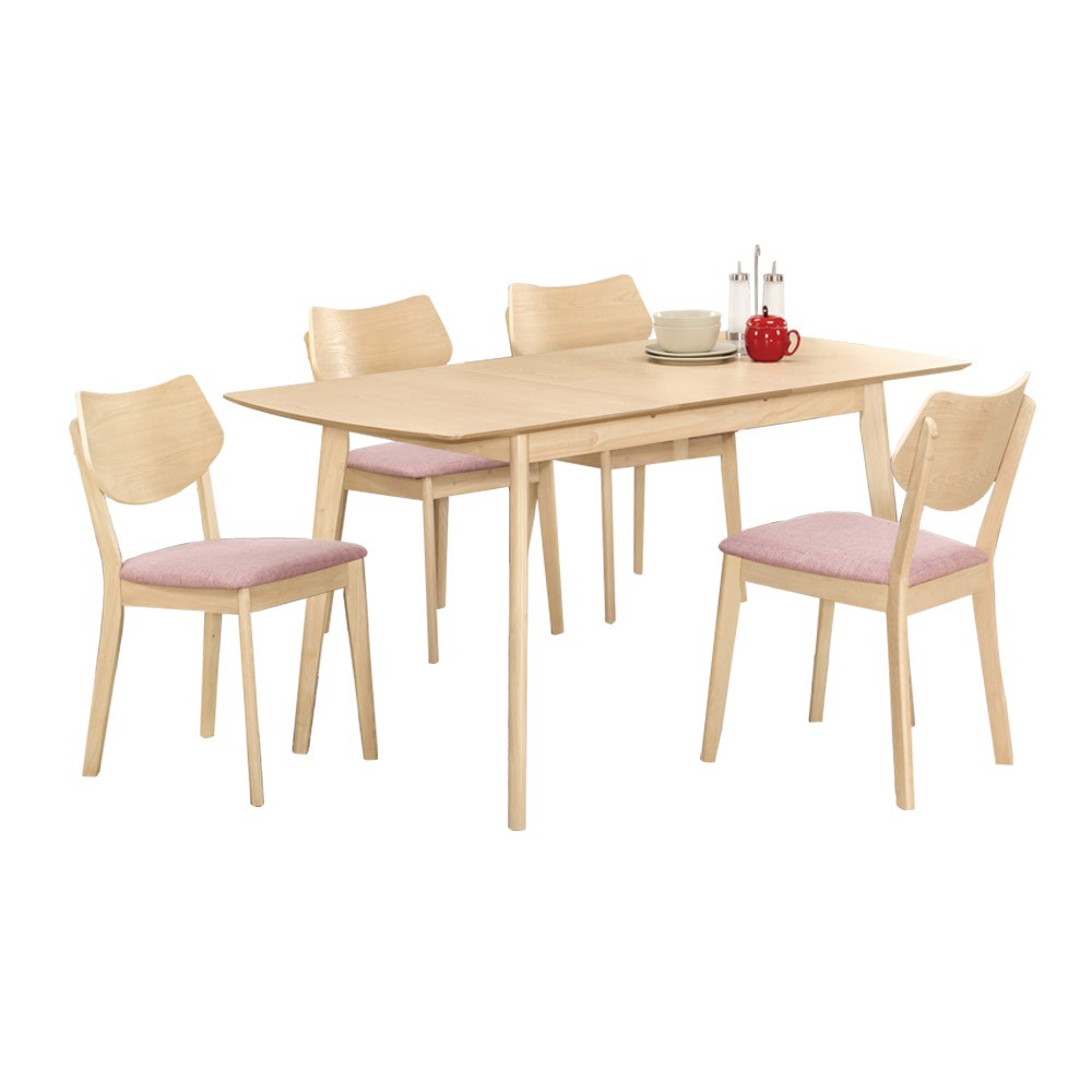 Boden-羅夫5尺北歐風拉合/伸縮功能餐桌椅組合(一桌四椅)(粉色布餐椅)