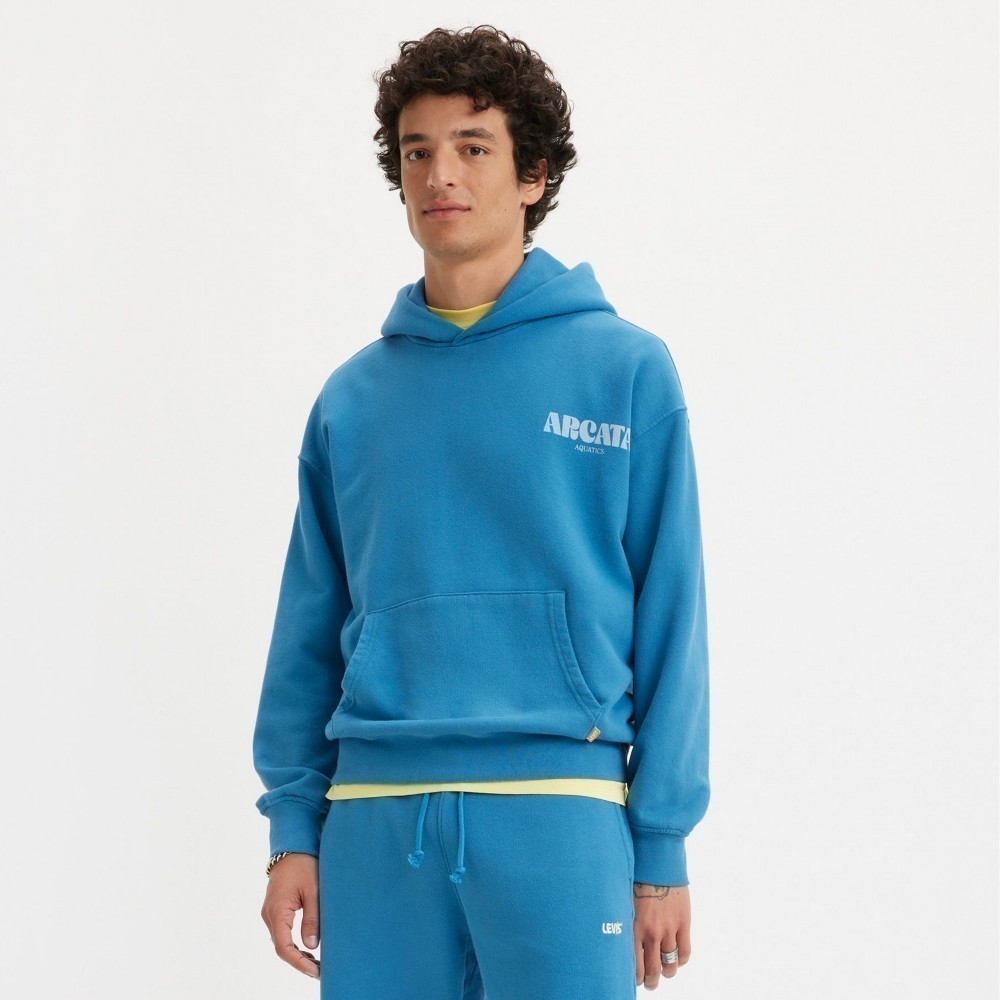 Levis Gold Tab金標系列 男款 寬鬆重磅落肩口袋帽T/厚棉 湖水藍 A3767-0023 熱賣單品