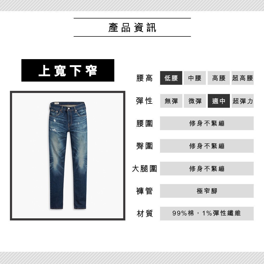 Levis 男款 上寬下窄 512 低腰修身窄管牛仔褲/精工微磨損補丁細節/彈性布料 熱賣單品 28833-0900