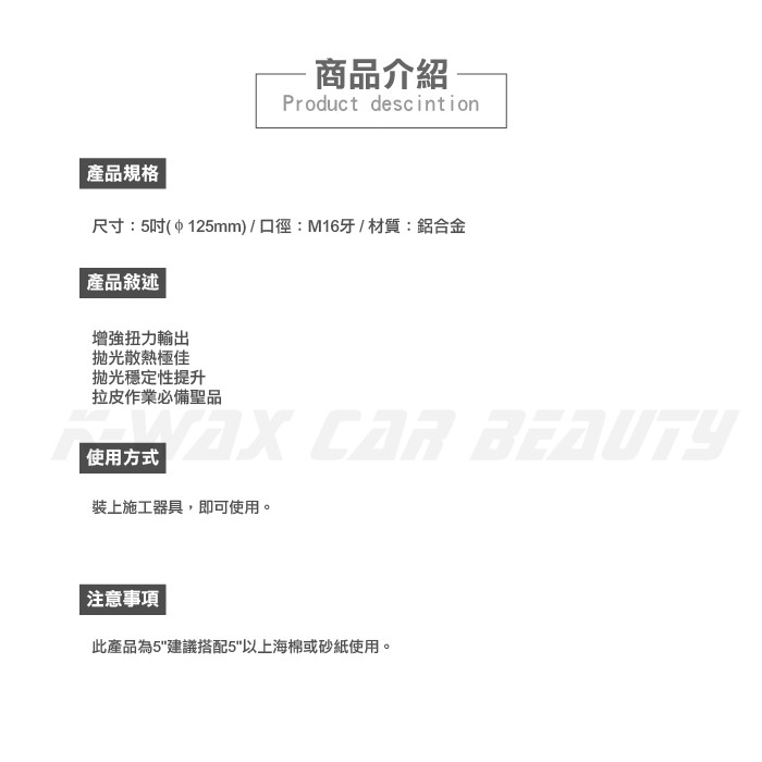 K-WAX 鋁合金底盤 / 鋁盤 5吋 拉皮底盤 M16牙 RO機 拋光機 拋光底盤 拉皮墊 鋁製盤 5吋底盤 魔鬼氈