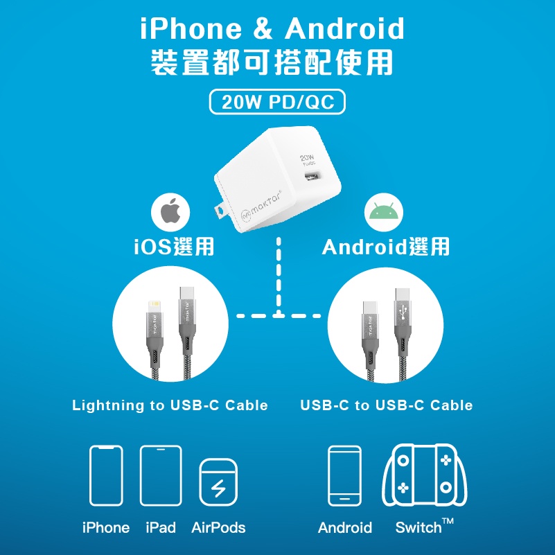 Maktar 〔 快充組 〕 20W GaN 口袋快充 USB-C充電器 含傳輸充電線 MFi 蘋果認證