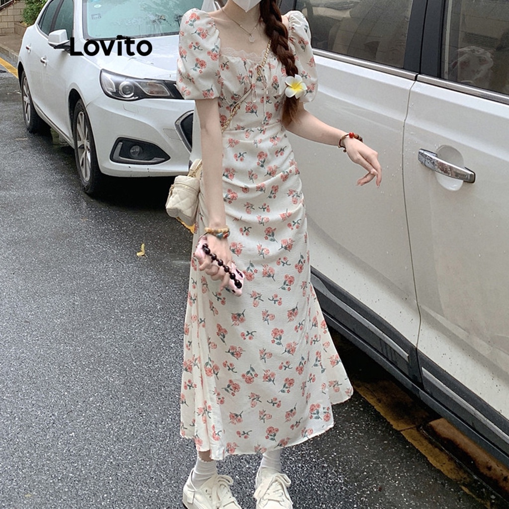 Lovito 波西米亞女式花卉褶飾蕾絲泡泡袖洋裝 LNE13089 (多色)