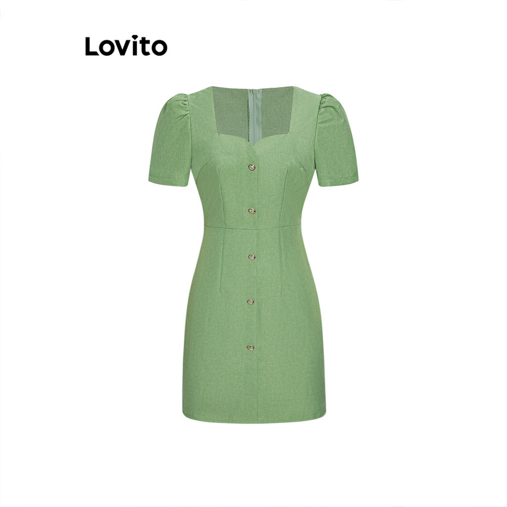 Lovito 休閒素色扇貝珍珠結構系列-女士甜心洋裝 L68ED299 (青綠色)