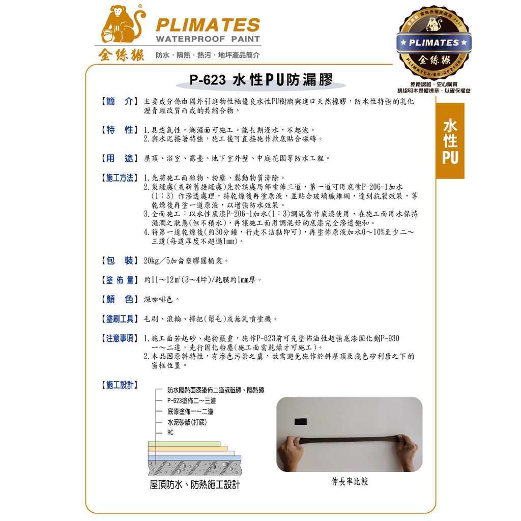 【Plimates 金絲猴】P-623 水性PU防漏膠 黑咖啡-5加侖裝