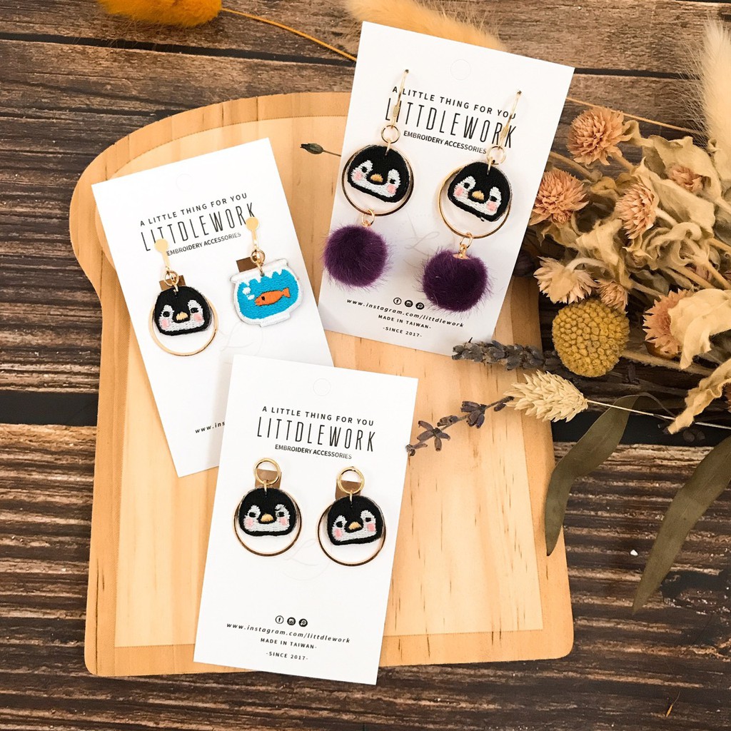【Littdlework旗艦館】刺繡耳環 - 小企鵝和魚缸