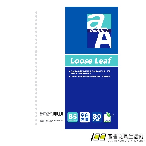 Double A / 活頁紙 / 空白內頁 / B5 / 26孔【100圖書文具生活館】