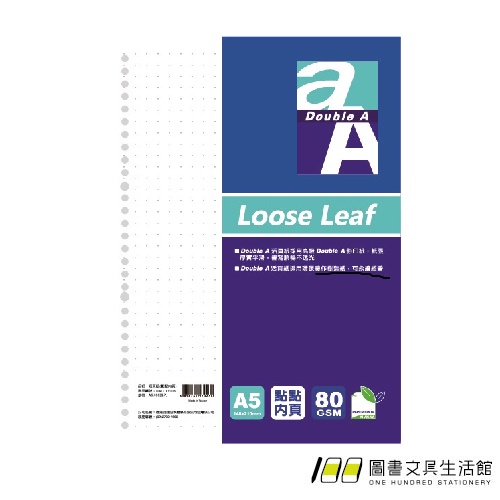 Double A / 活頁紙 / 點點內頁 / A5 / 20孔【100圖書文具生活館】