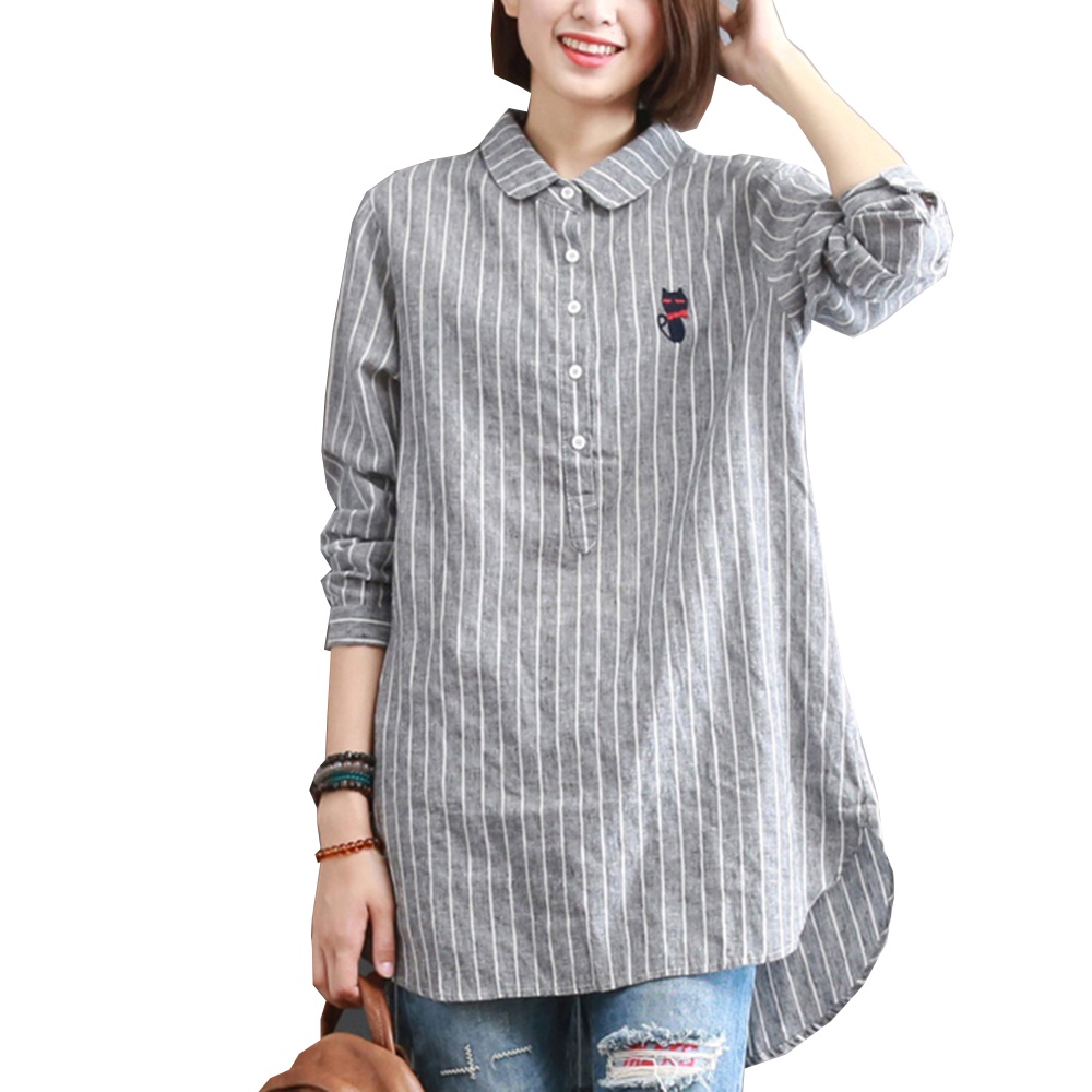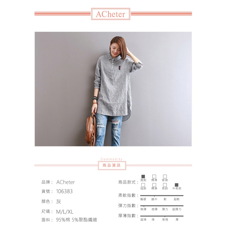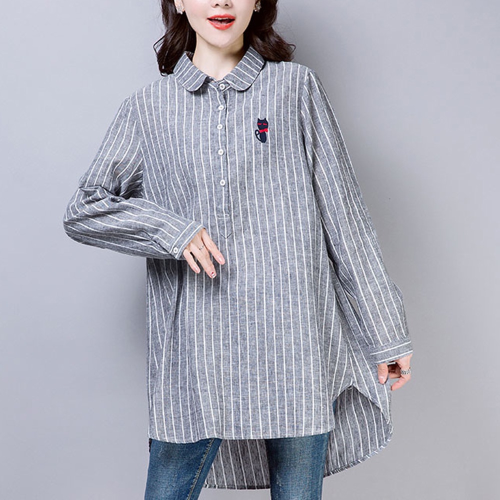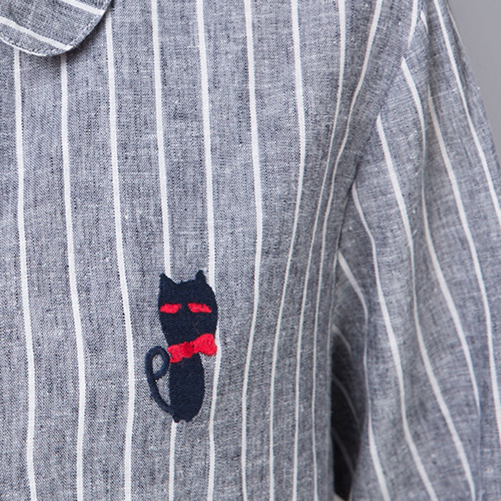 【ACheter】森林童趣貓咪刺繡棉麻條紋長版襯衫106383