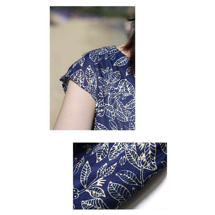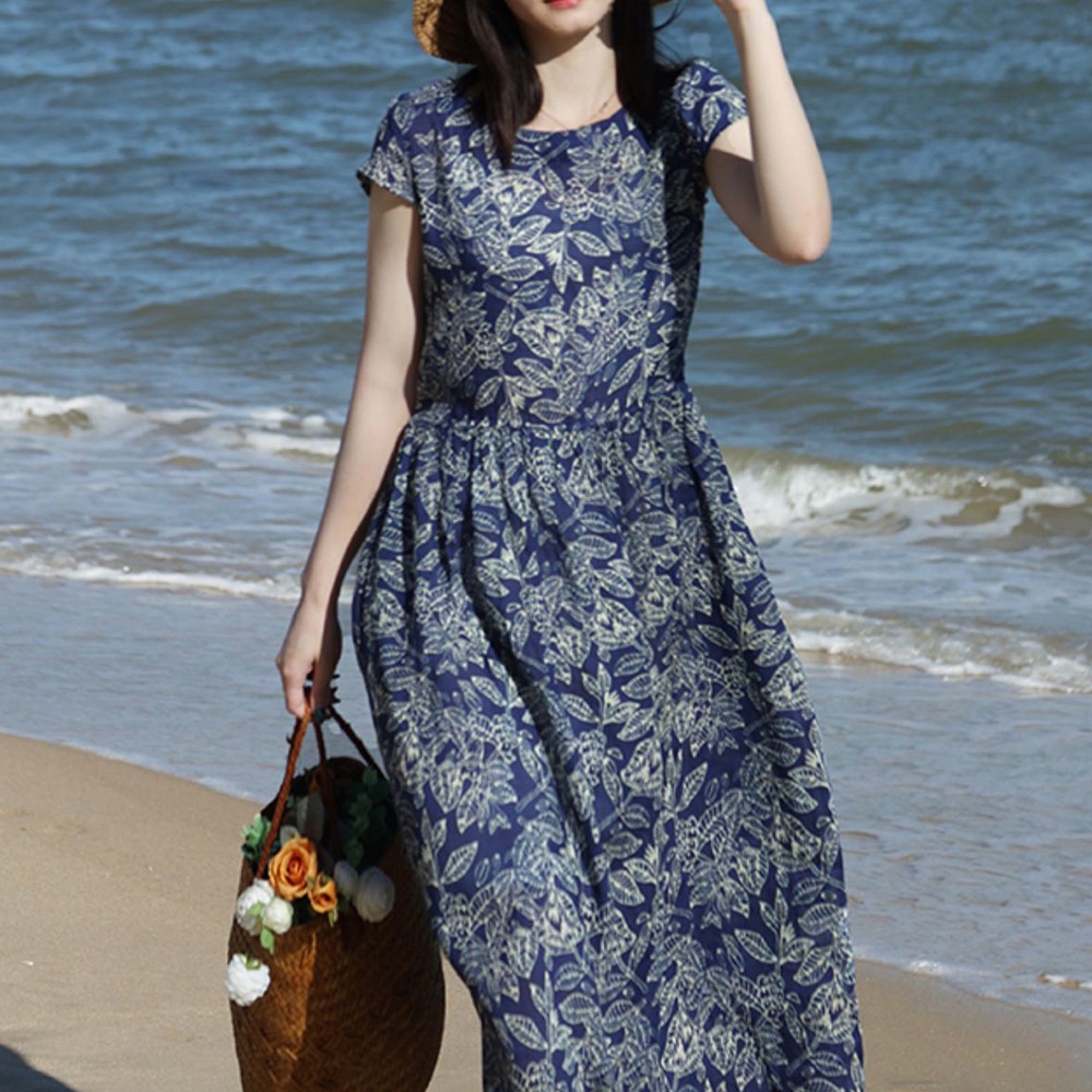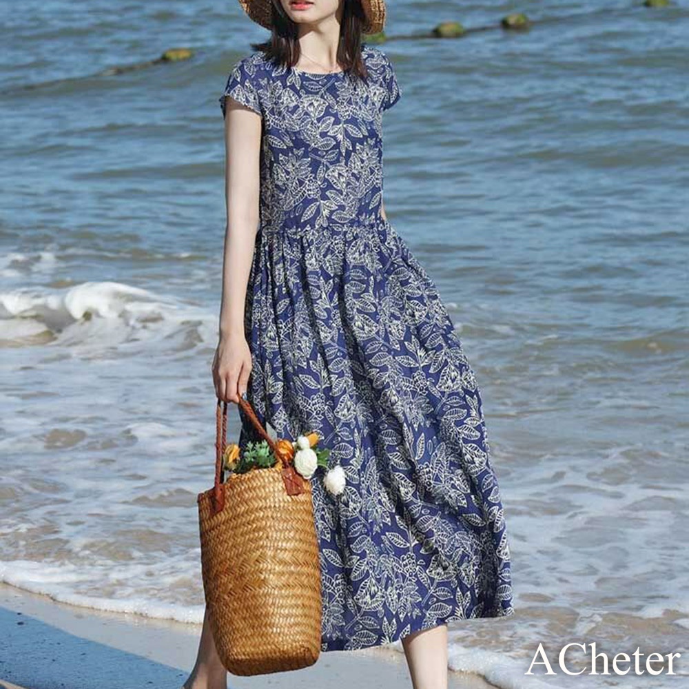 【ACheter】 藍瓷印花渡假慵懶風棉麻洋裝# 112308