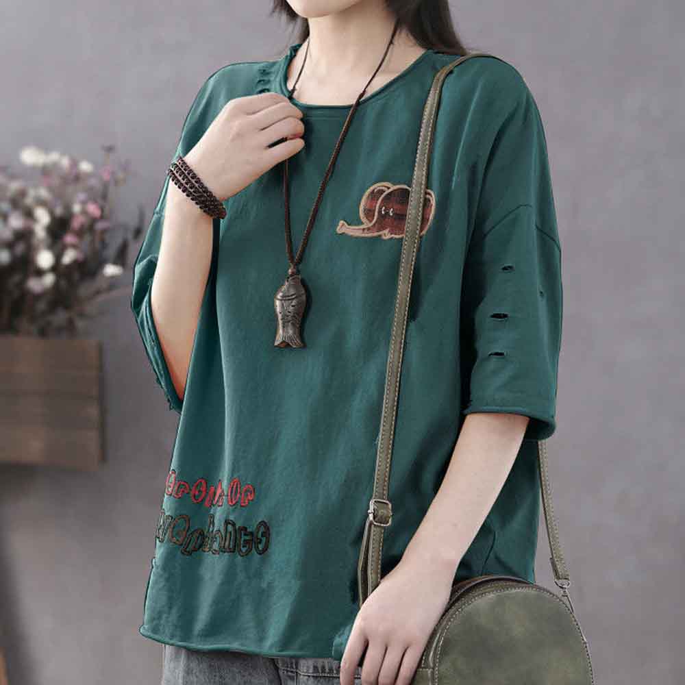 【A.Cheter】韓版大碼破洞造型感大象印花五分袖T恤上衣110024