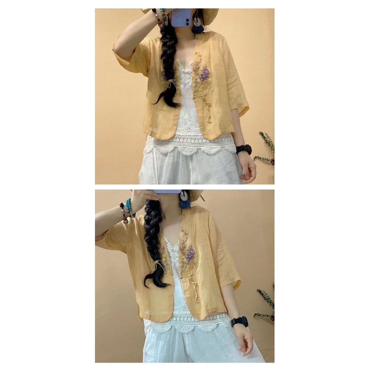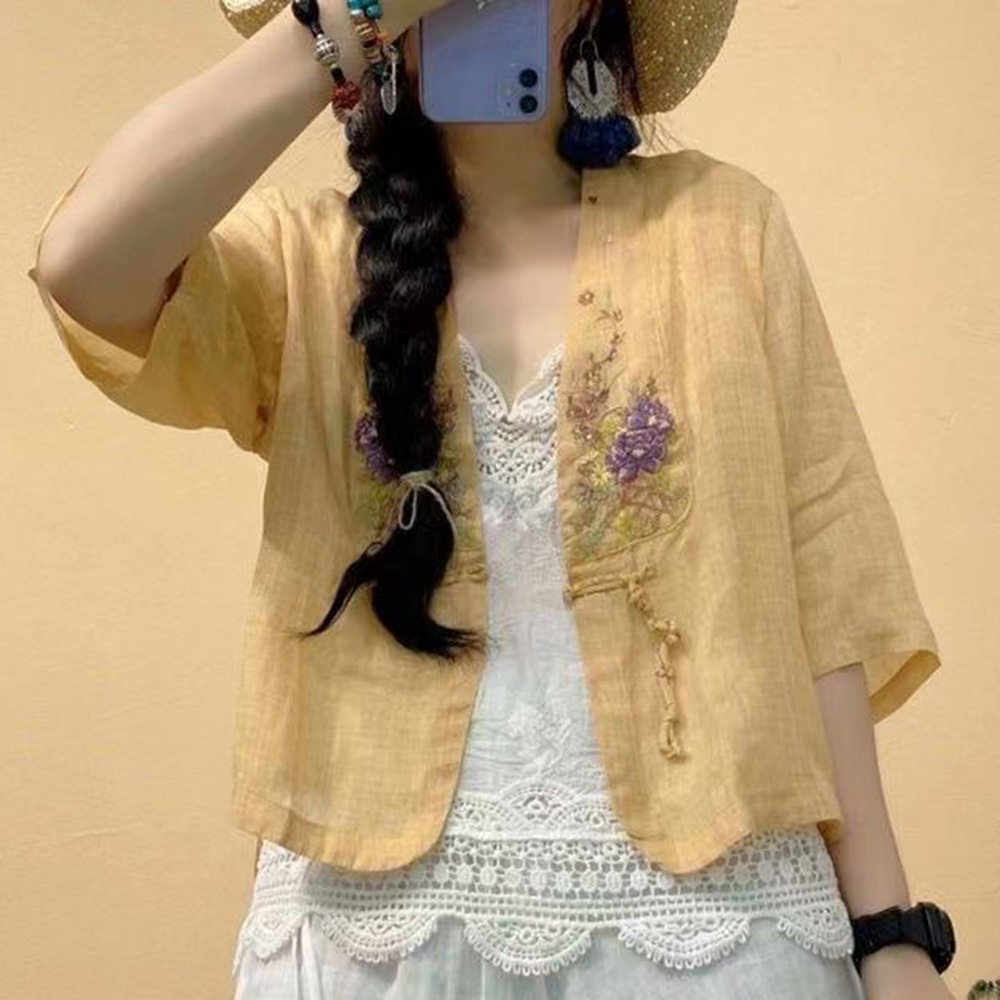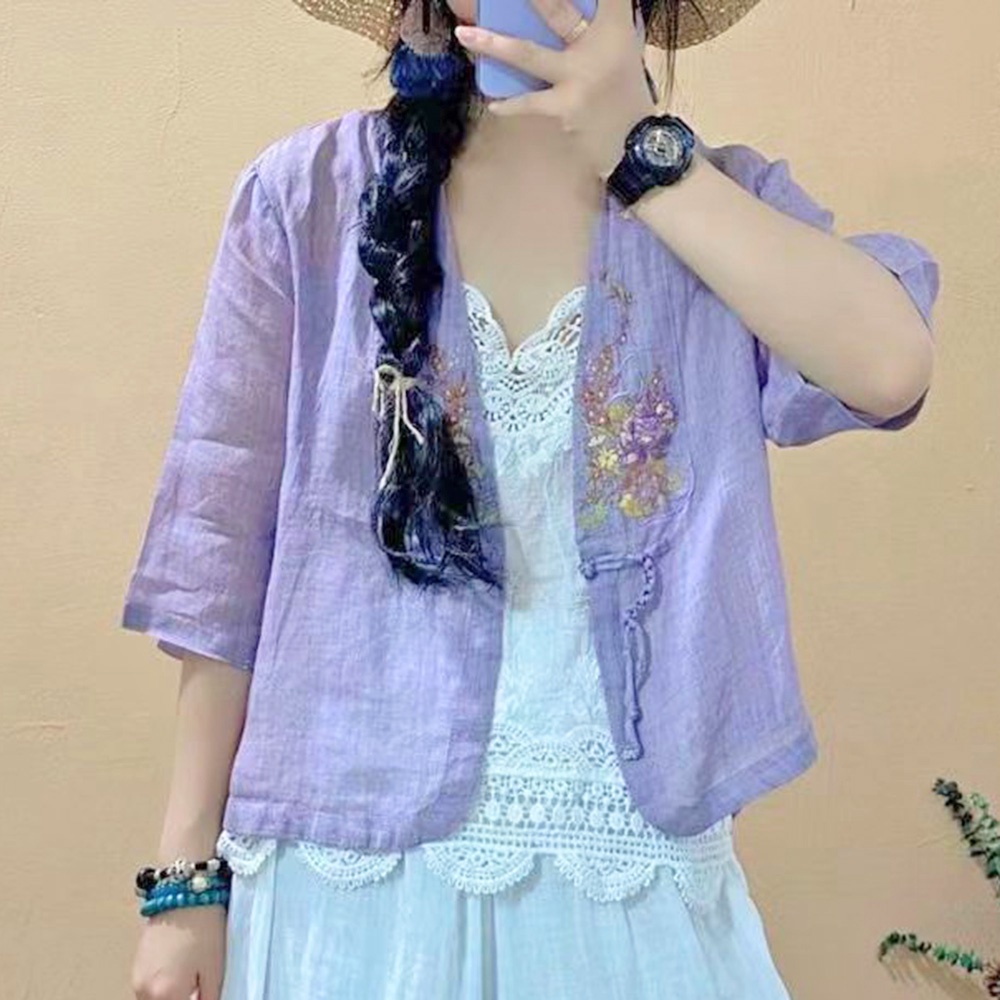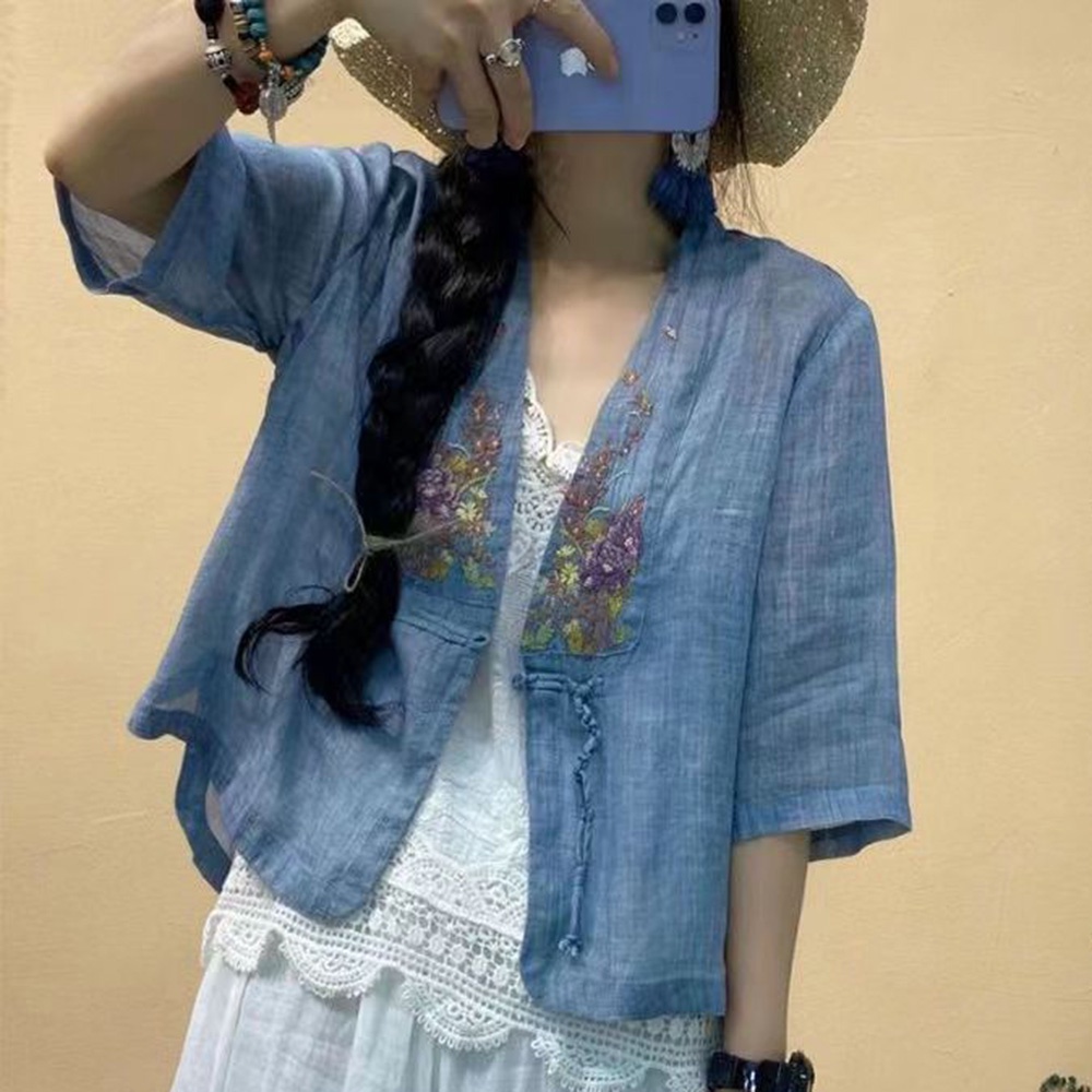 【ACheter】 夏季民族風盤扣V領棉麻刺繡罩衫# 112460
