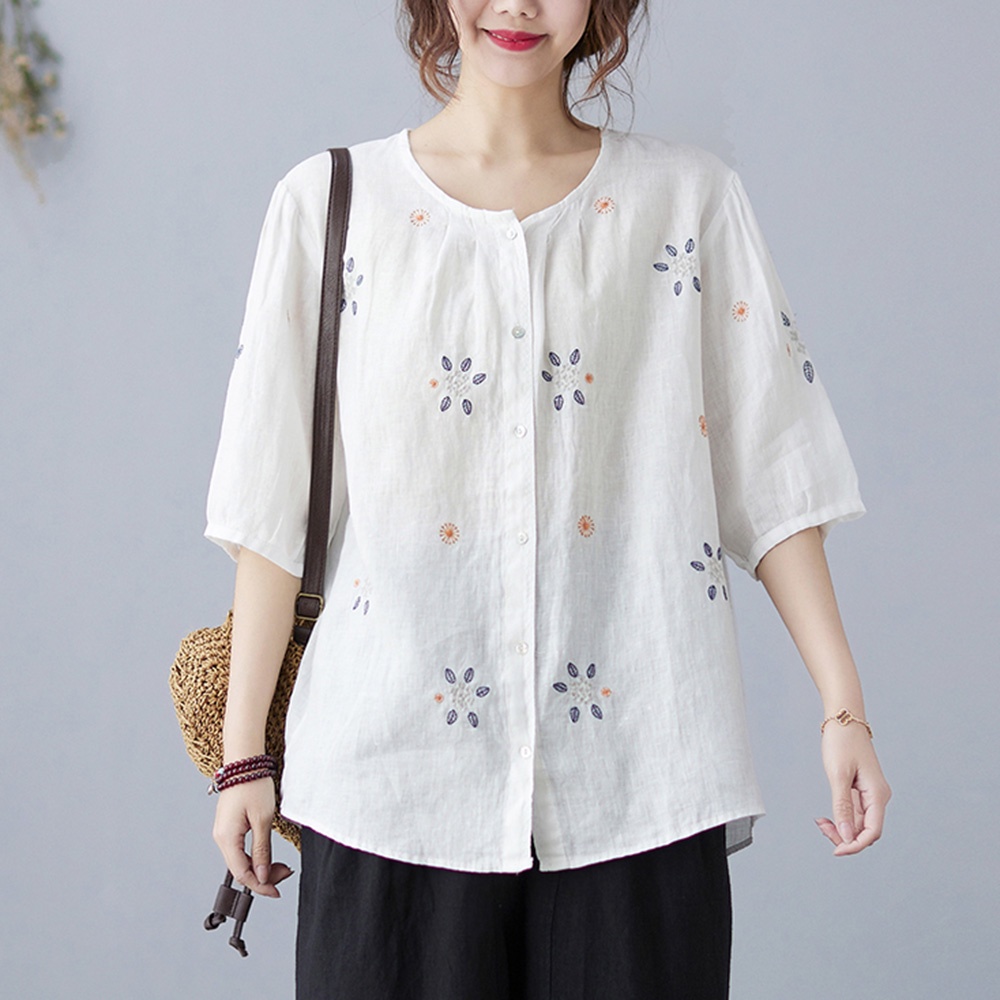 【ACheter】繡花寬鬆棉麻涼感襯衫上衣#113255現貨+預購(2色)