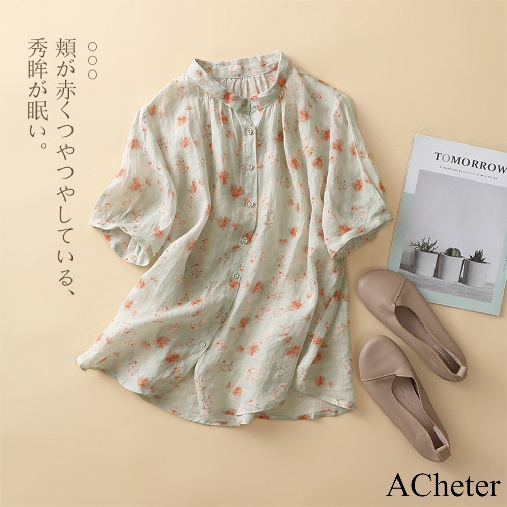 【ACheter】印花寬鬆顯瘦棉麻短袖襯衫上衣#113249現貨+預購(2色)