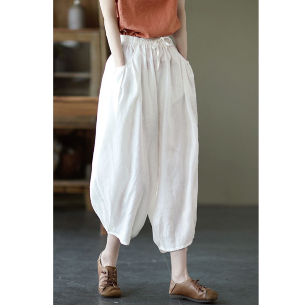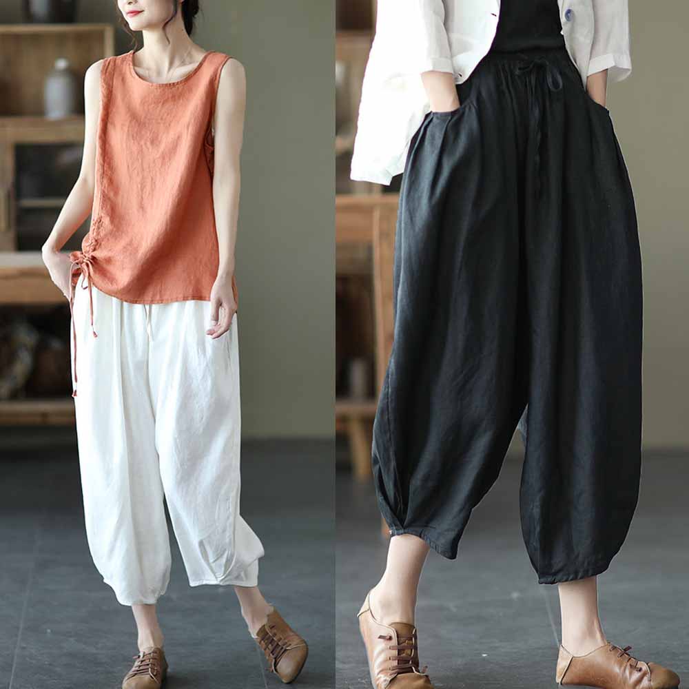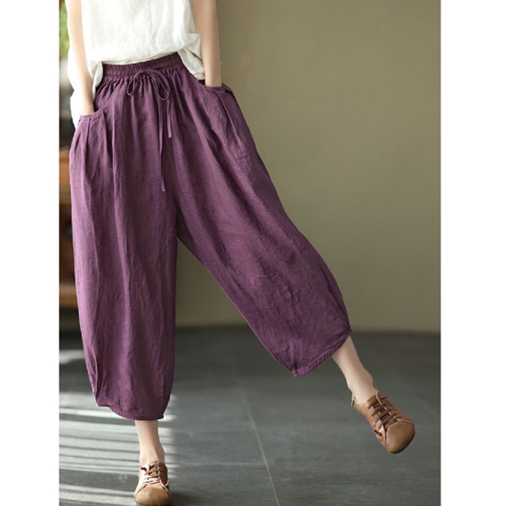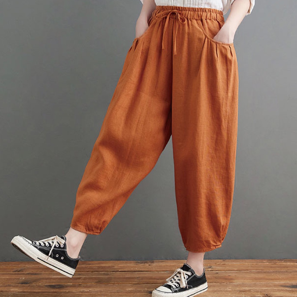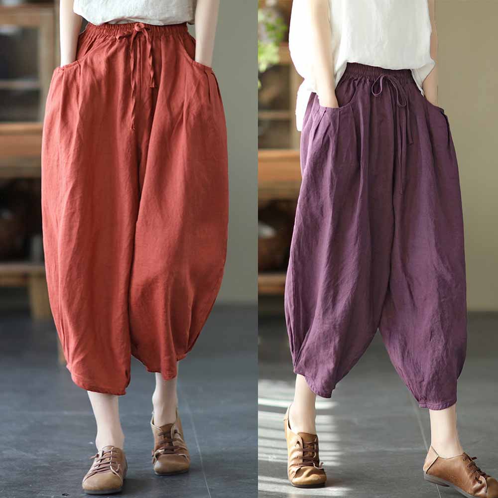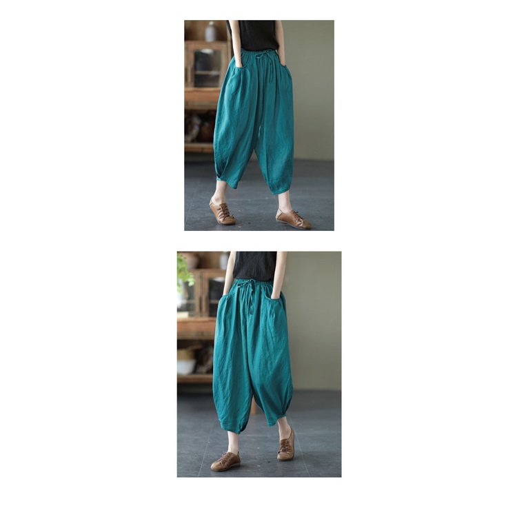 【ACheter】 復古亞麻棉休閒鬆緊腰寬鬆九分燈籠褲# 109646