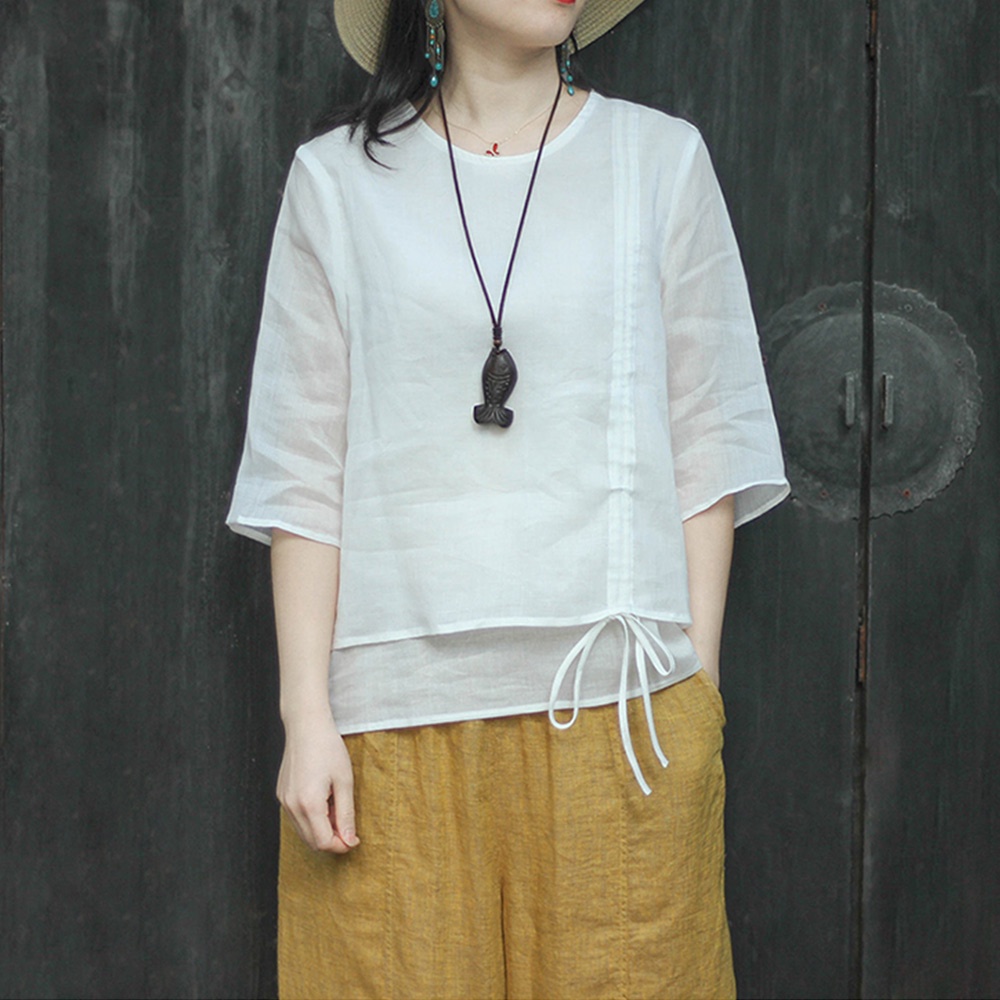 【ACheter】純色別緻抽繩設計感圓領復古棉麻感襯衣108977