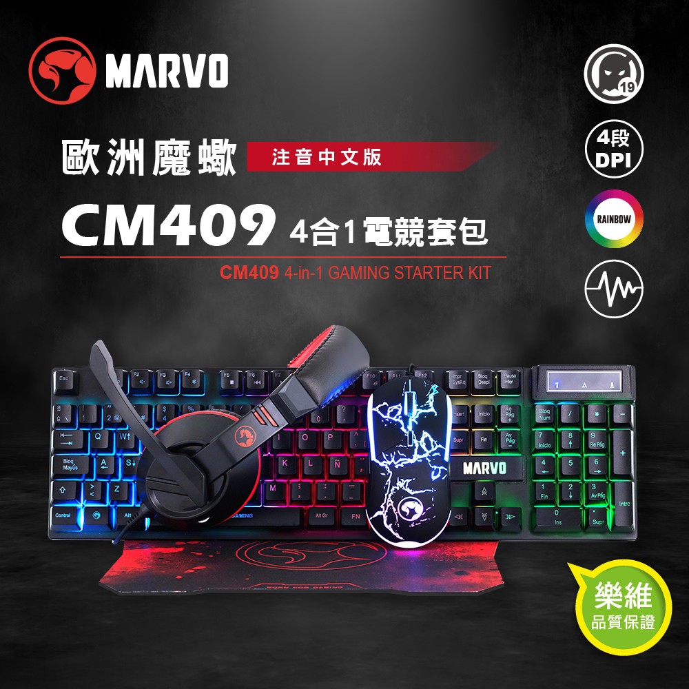 MARVO 歐洲魔蠍 CM409 4合1 有線鍵盤滑鼠組 薄膜式 鍵盤 滑鼠 耳麥 滑鼠墊 中文|樂維官方公司貨