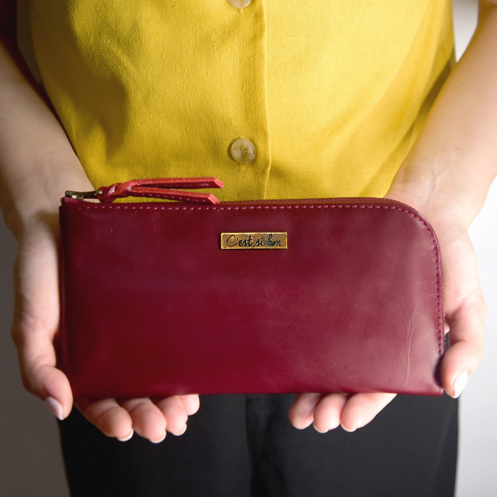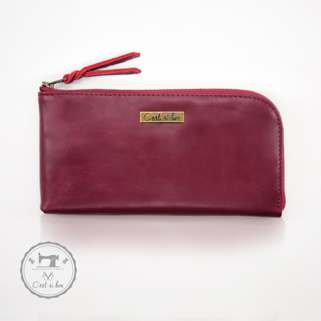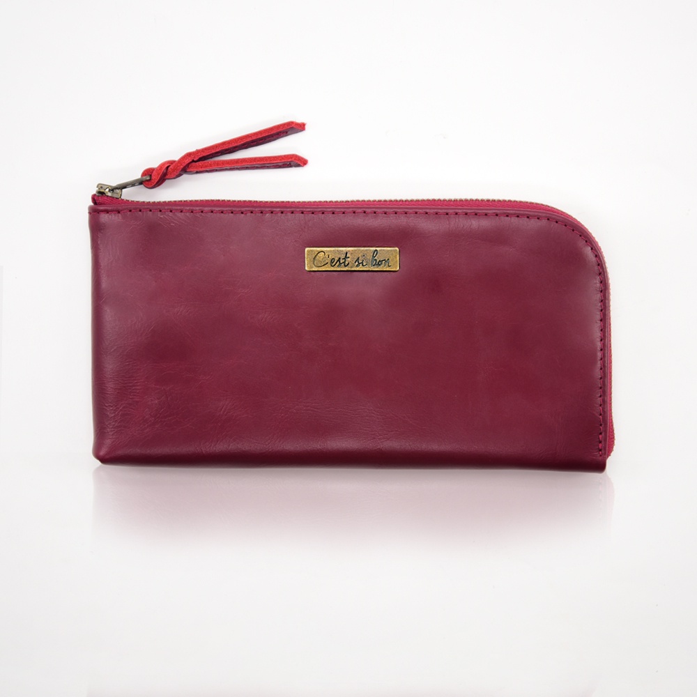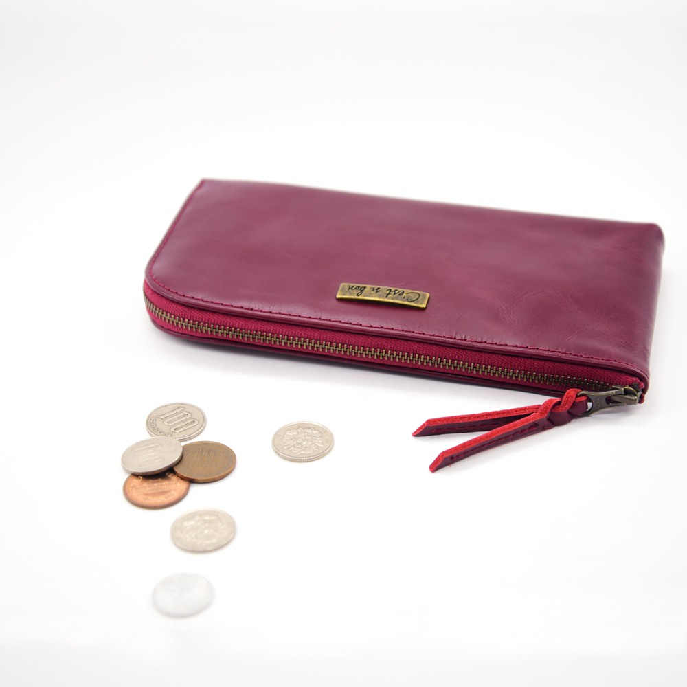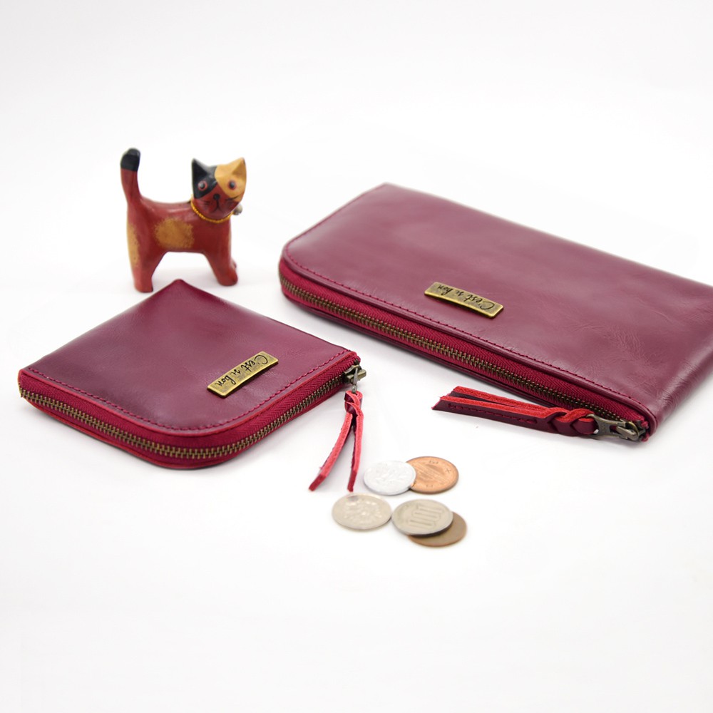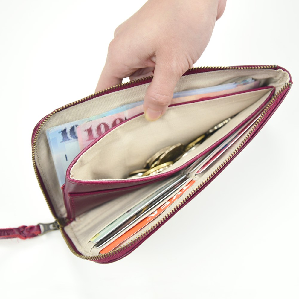 【散事舖】拉鍊式真皮長夾(深玫紅)L型開口 手拿包