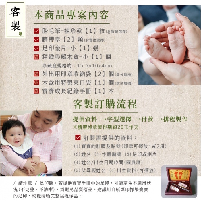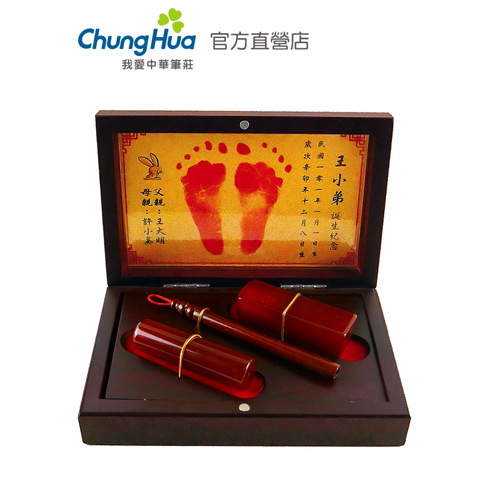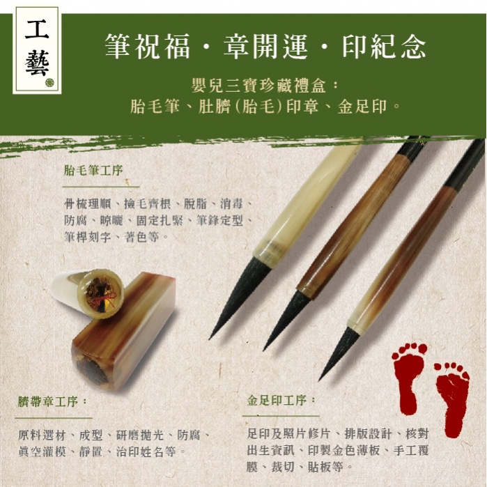 【中華筆莊】圓和樂 小收藏禮盒A-袖珍胎毛筆1入(檀木/赤牛角擇一)+臍帶章2入(水晶生肖/玉髓/赤牛角擇一)+金足印