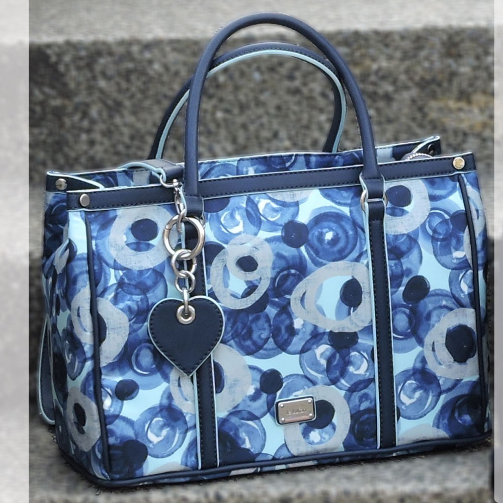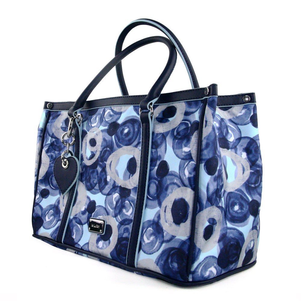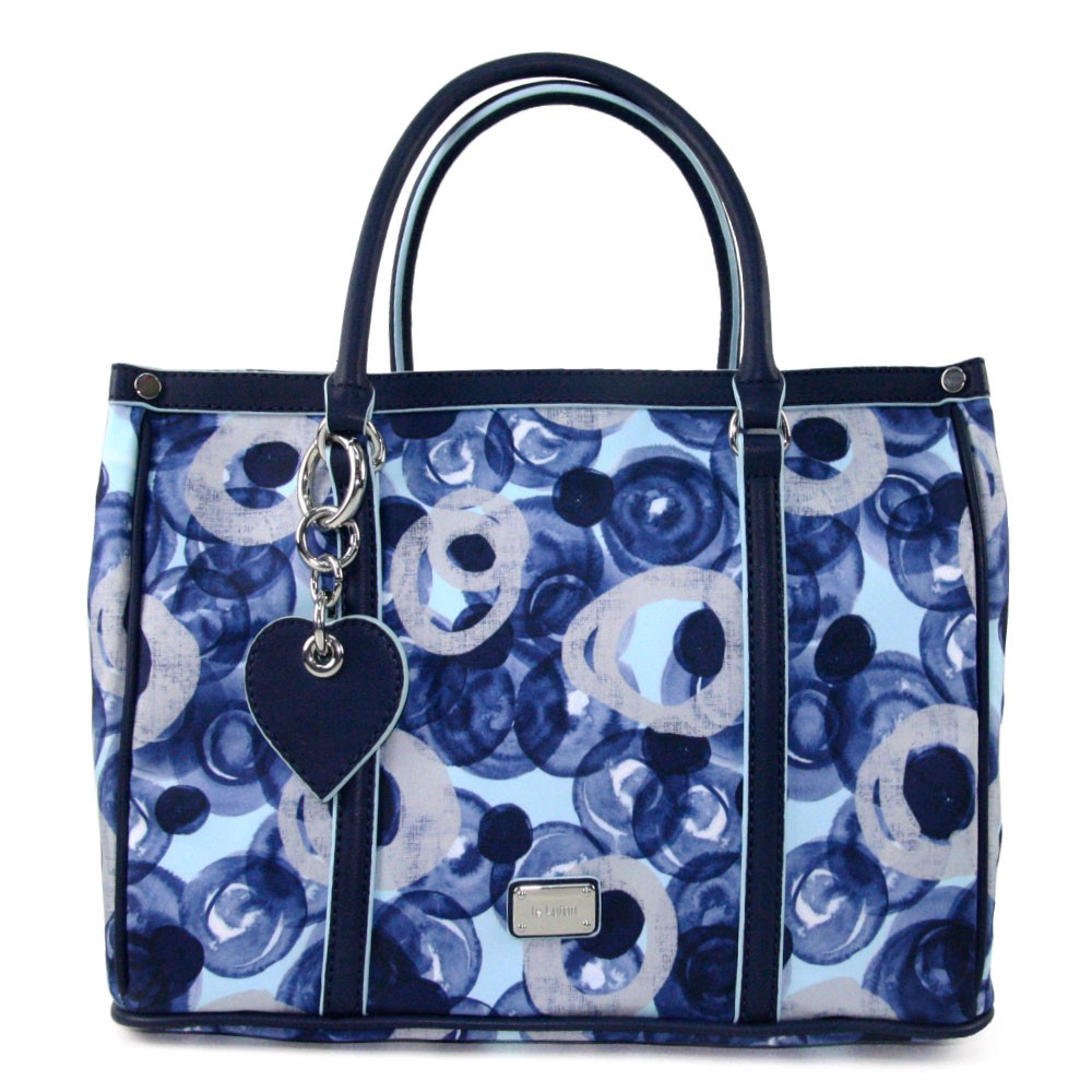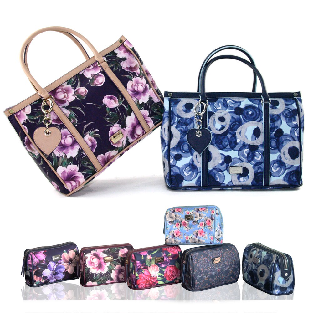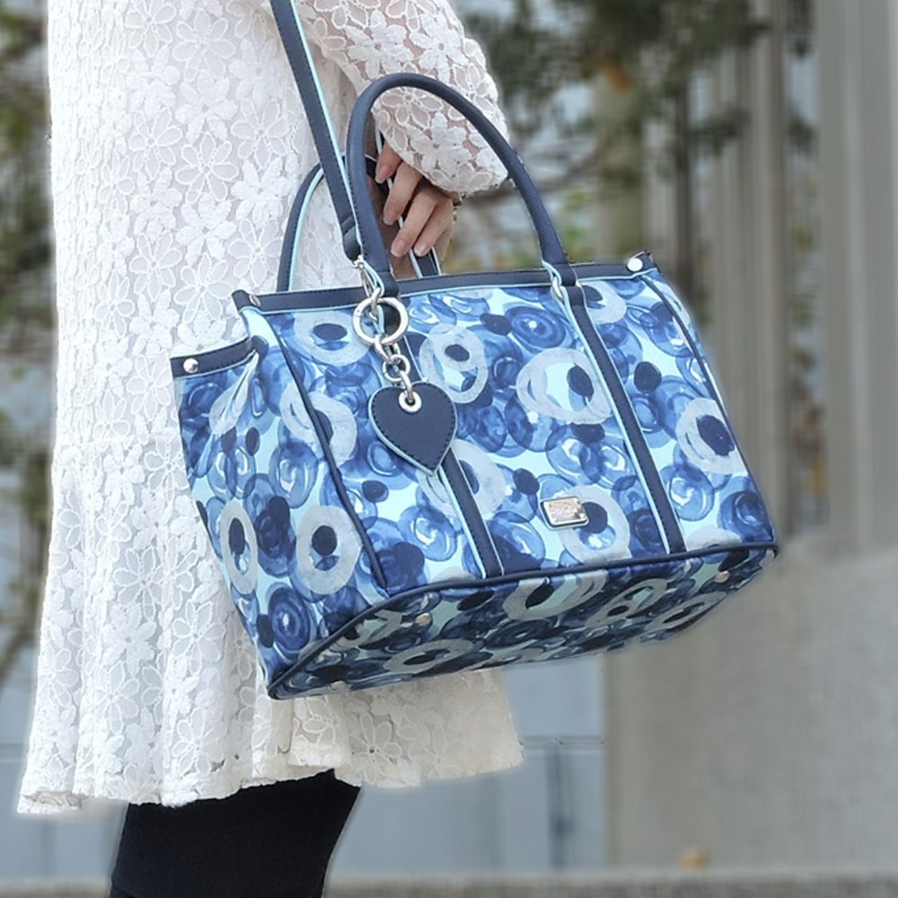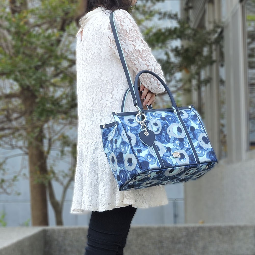 【Le Lufon】藍色心型吊飾紫牡丹花卉印花防潑包併皮革托特包(L)2way 肩背包/手提包/斜背包