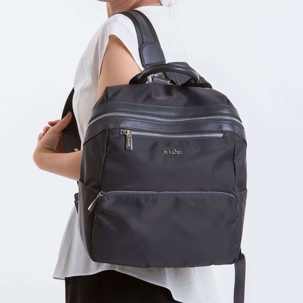 le Lufon 深灰色防潑尼龍拼皮革後背包(L)2way包 手提包/後背包-碳灰色 輕量型男女兩用包