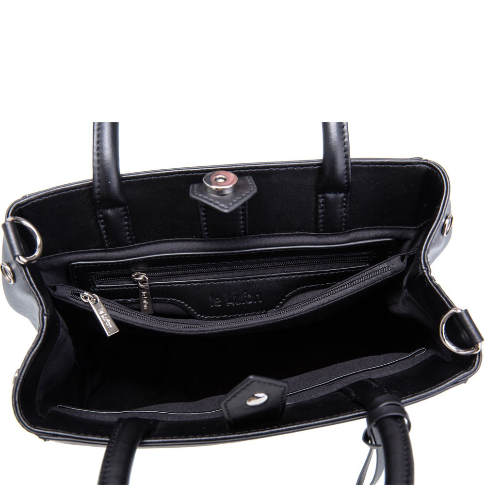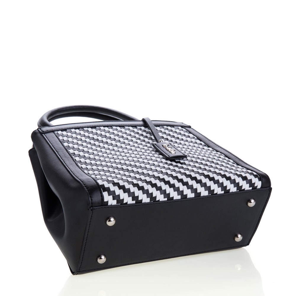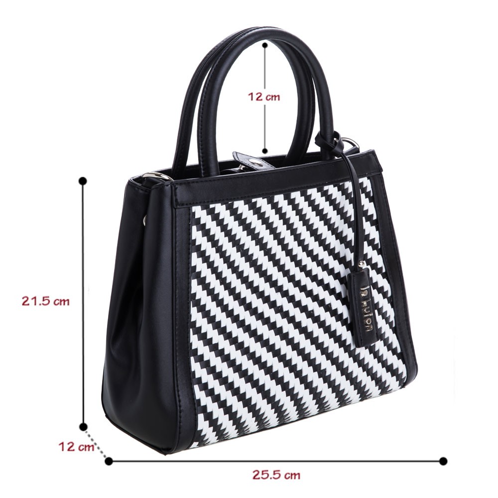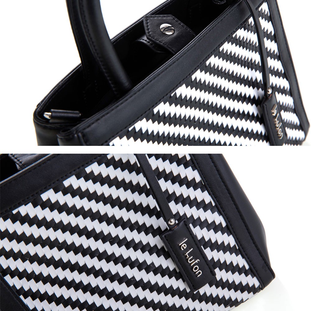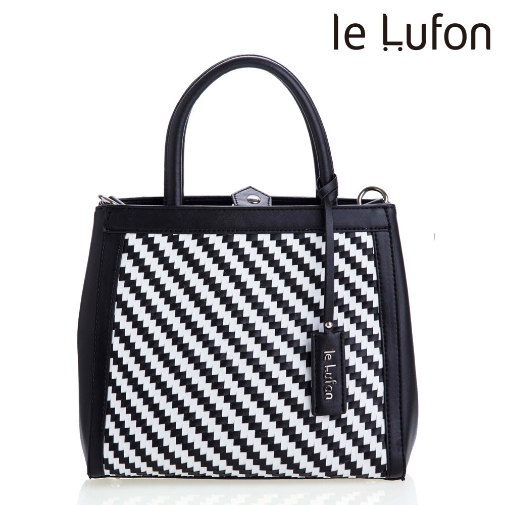 【le Lufon】黑白色編織交錯面金屬吊飾簡約設計可敞開式蝙蝠版型 兩用手提包 (S)手提包/斜背包/側背包