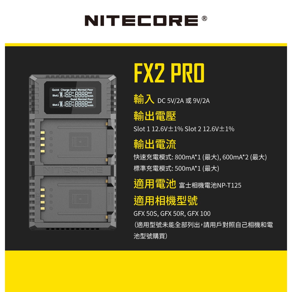 NITECORE FX2 Pro 液晶顯示 USB 雙槽快充充電器 For 富士 Fuji NP- T125 公司貨