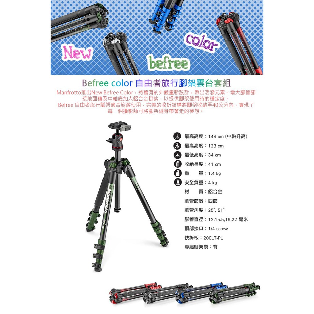 Manfrotto New Befree Color 自由者旅行腳架套組 MKBFRA4GR-BH (綠/新款)