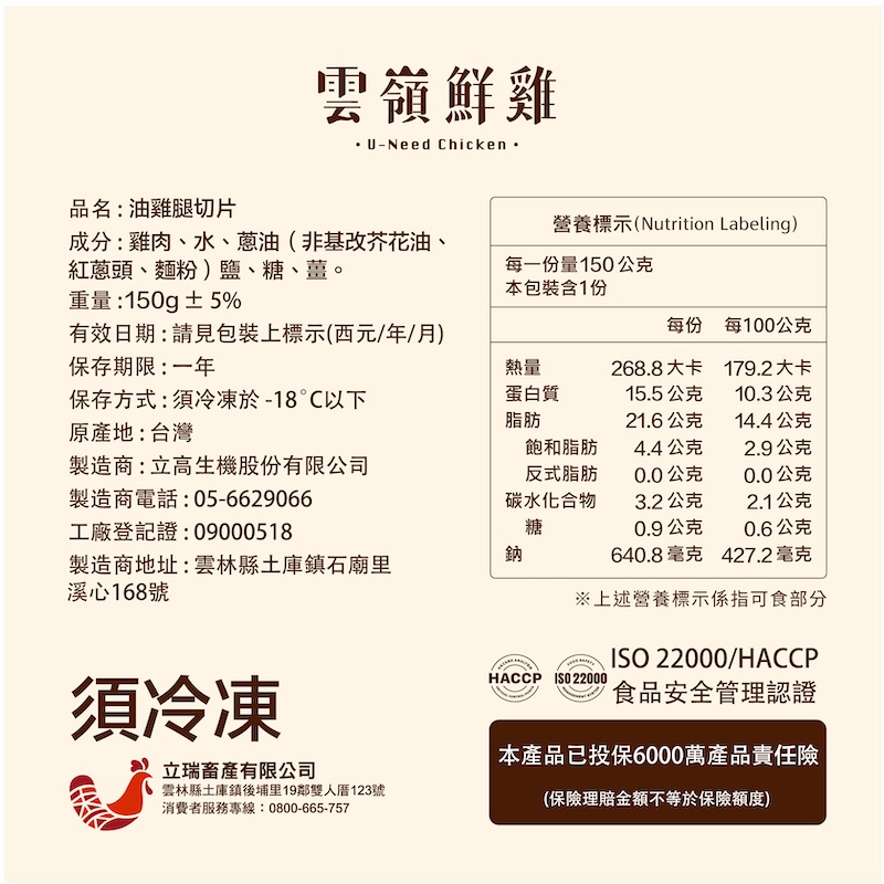 【雲嶺鮮雞】 油雞腿切片(150g/份)