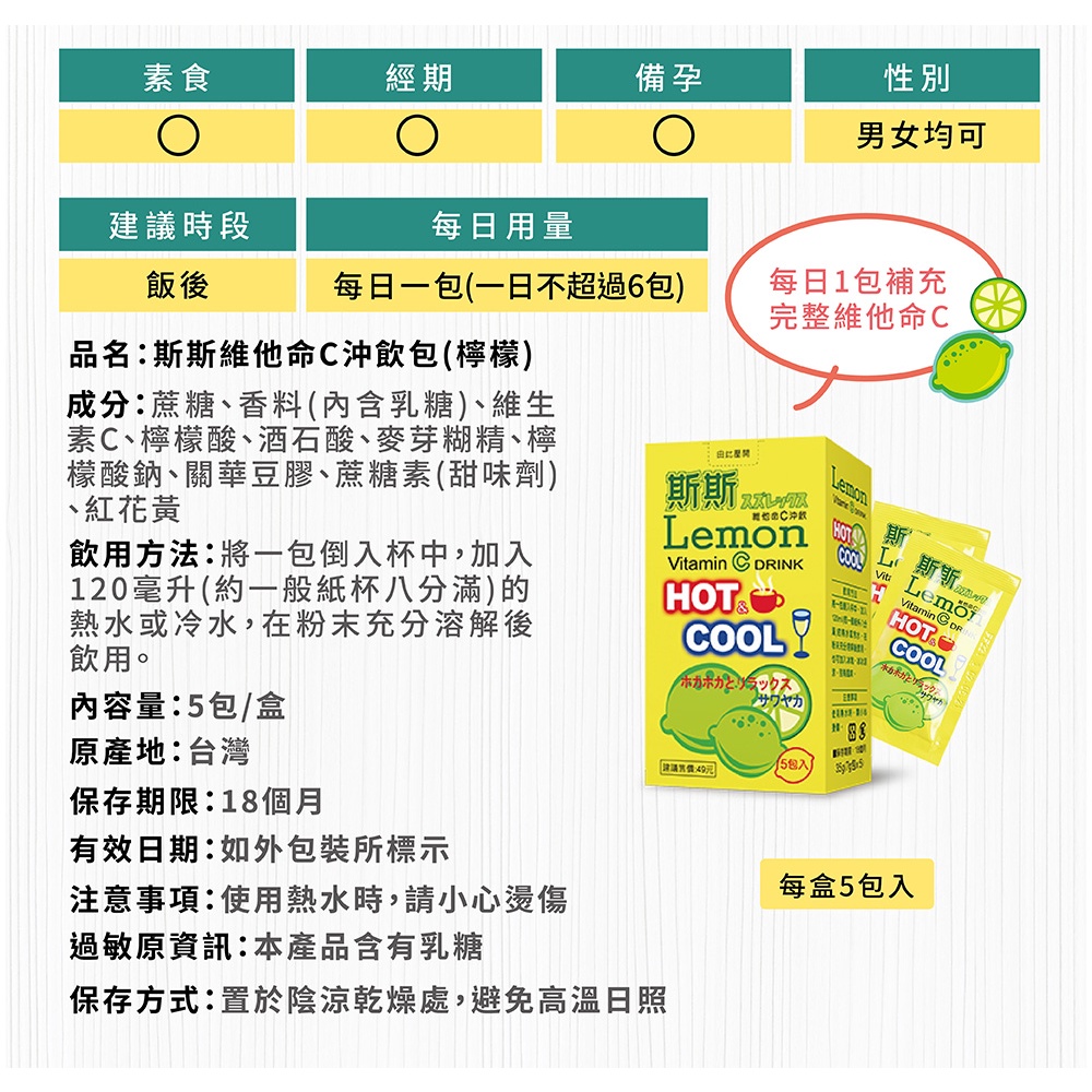 【五洲生技】斯斯維他命C沖飲包 (檸檬) _30盒/150包、60盒/300包 美肌保健、機能性食品