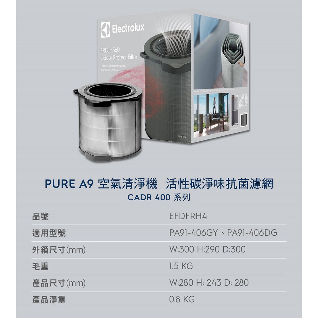Electrolux 伊萊克斯 PURE A9/A9.2 空氣清淨機活性碳淨味抗菌濾網組22坪內專用(EFDFRH4)