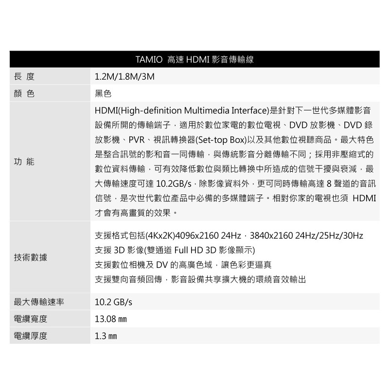 tamio 高速HDMI影音傳輸線 FHD 1.2m/長度 台灣製造