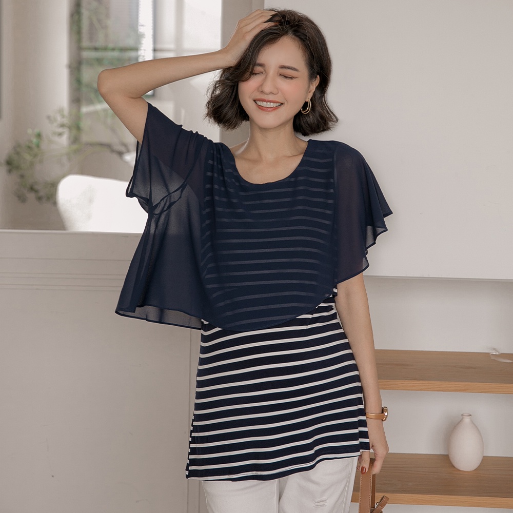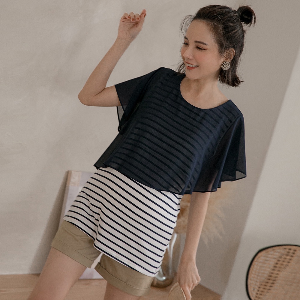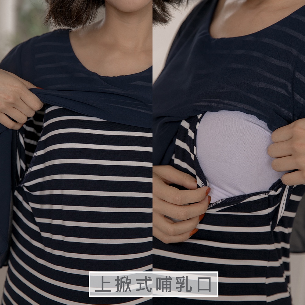 【棠棠媽咪】內條紋外雪紡斜襬上掀哺乳衣 哺乳裝 孕婦裝 假兩件上衣 - 10120060