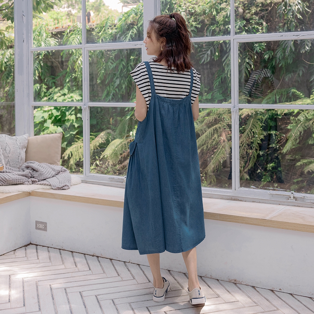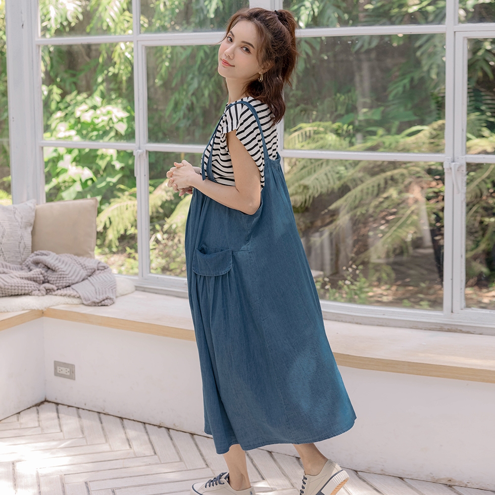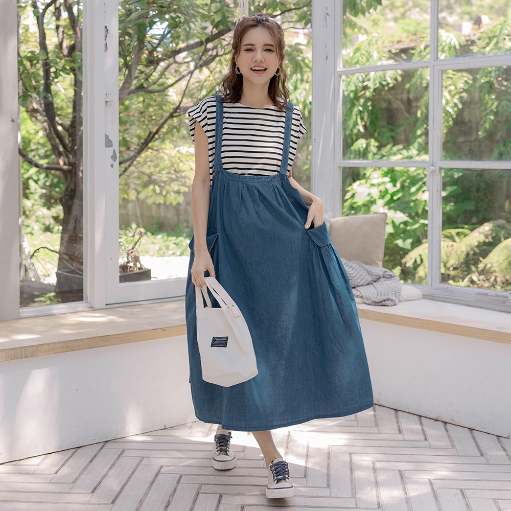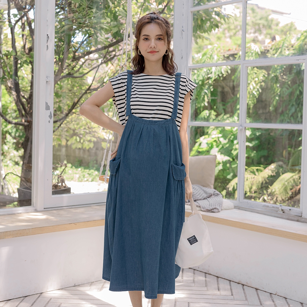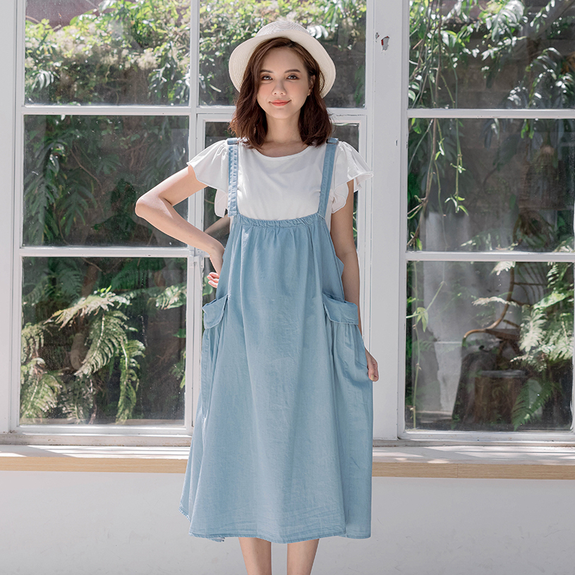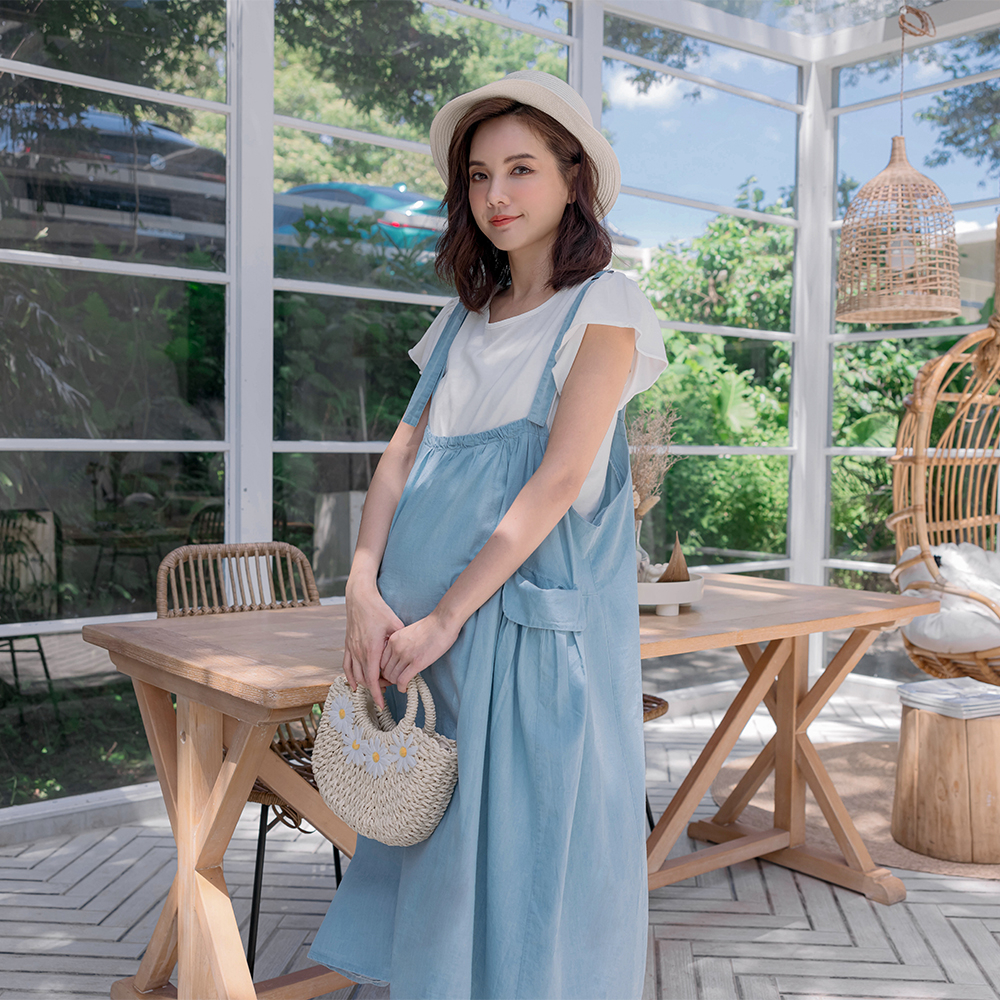 【棠棠媽咪】抓摺袋水洗牛仔吊帶裙(薄) 孕婦裝 軟牛仔 可愛 - 06230022