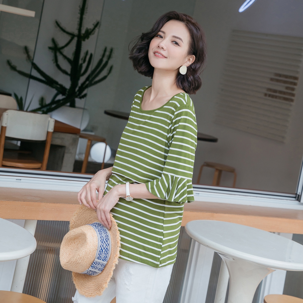 【棠棠媽咪】涼感棉條紋七分荷葉袖上掀哺乳T(薄) 可內搭哺乳裝 孕婦裝 - 10420029