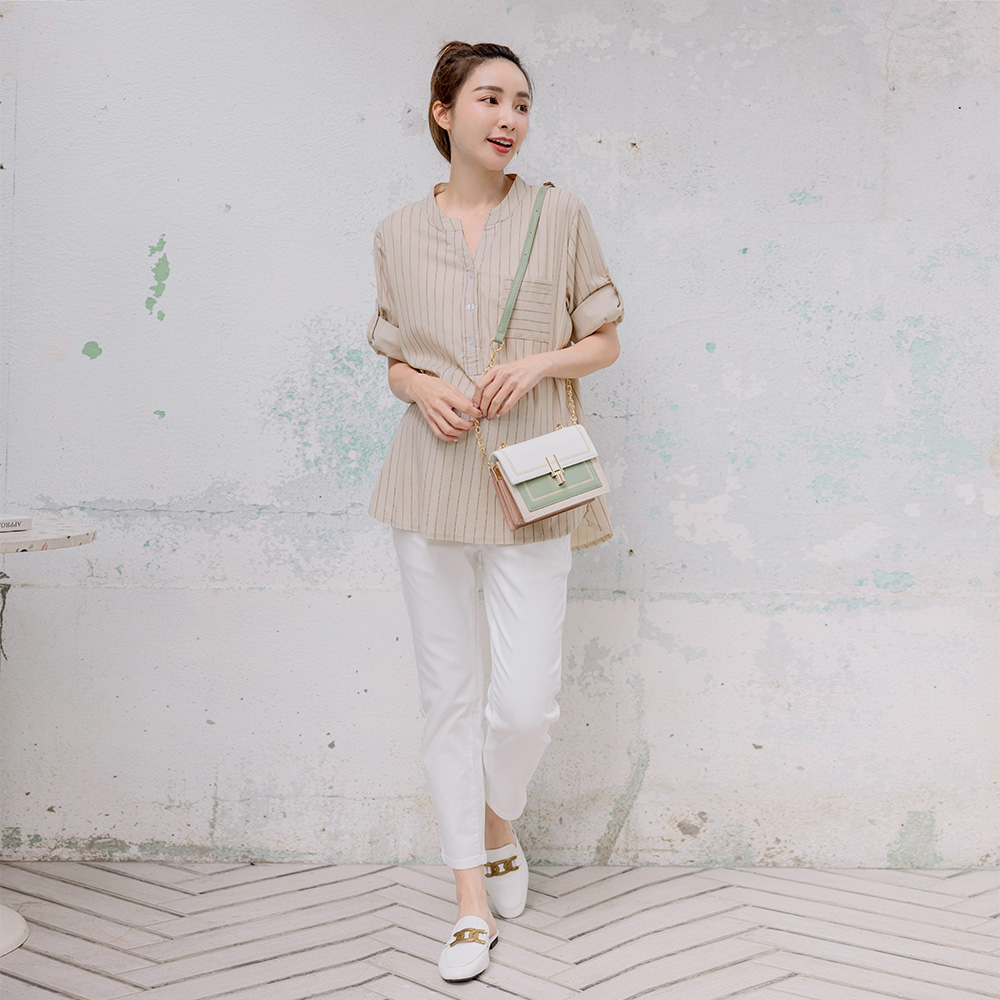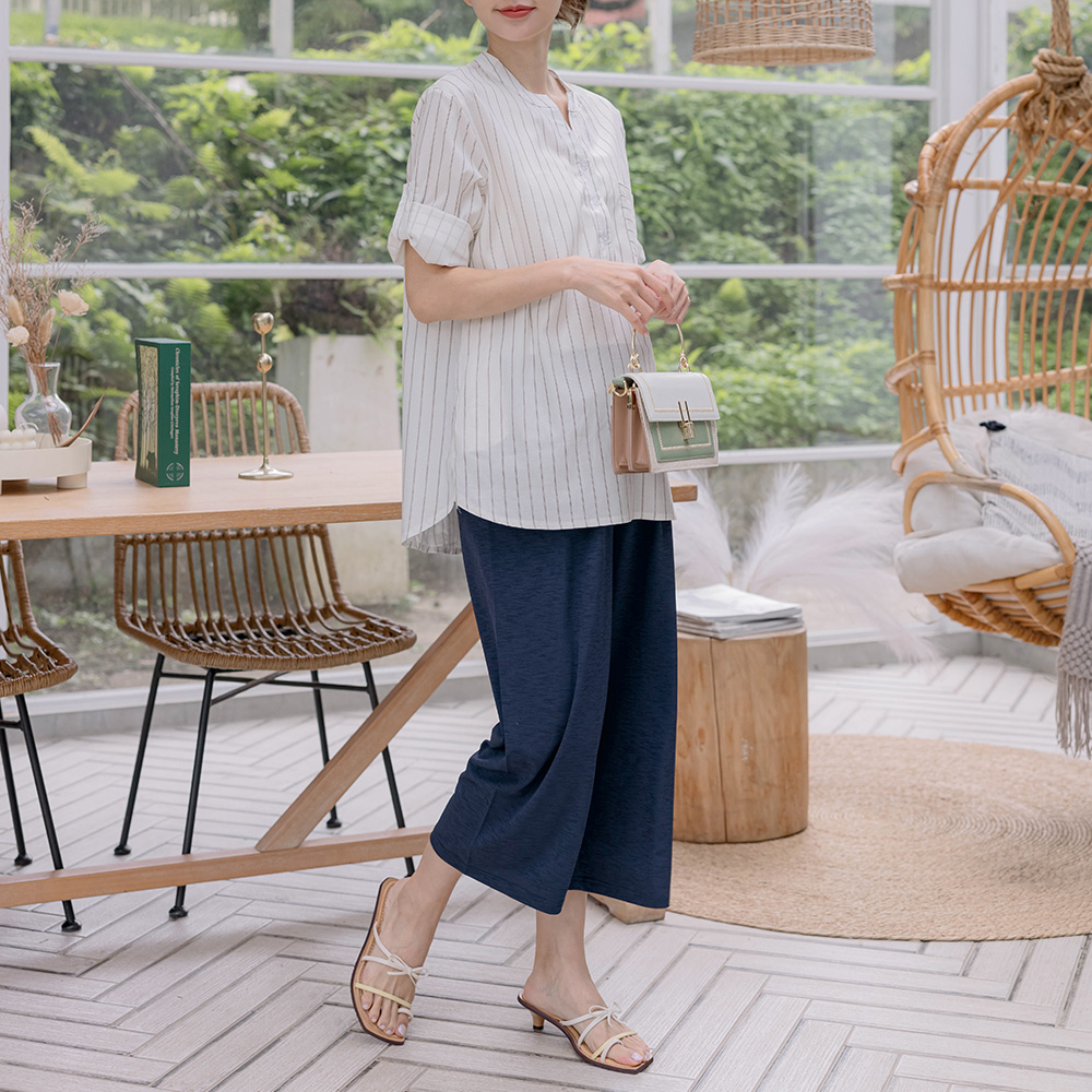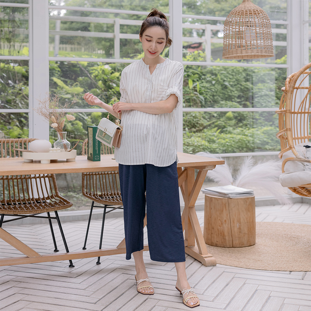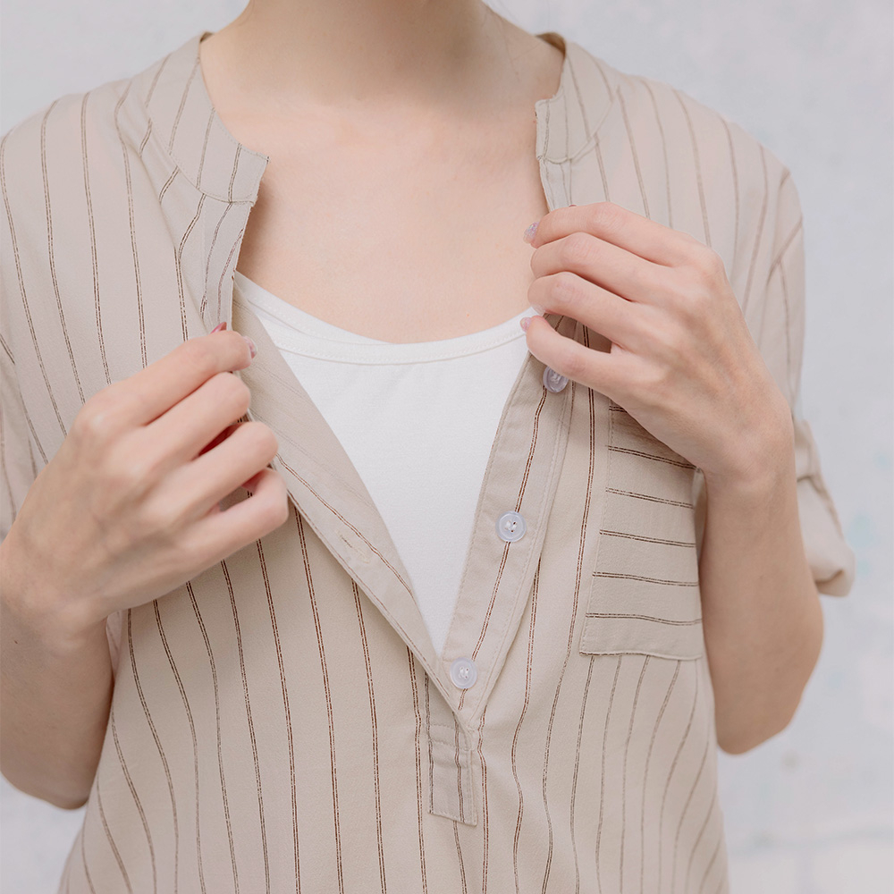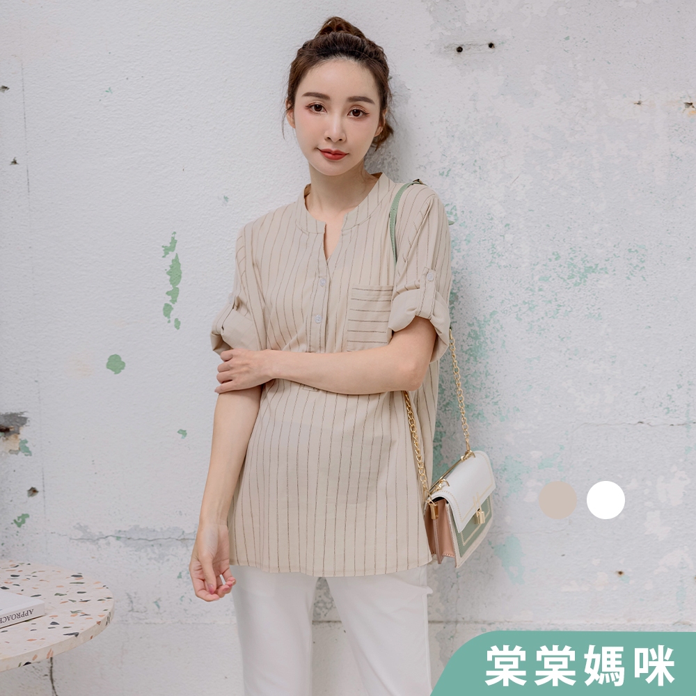 【棠棠媽咪】V開釦直紋七分拉袖哺乳襯衫 哺乳衣 孕婦裝 修身 OL Y字領 - 10170006