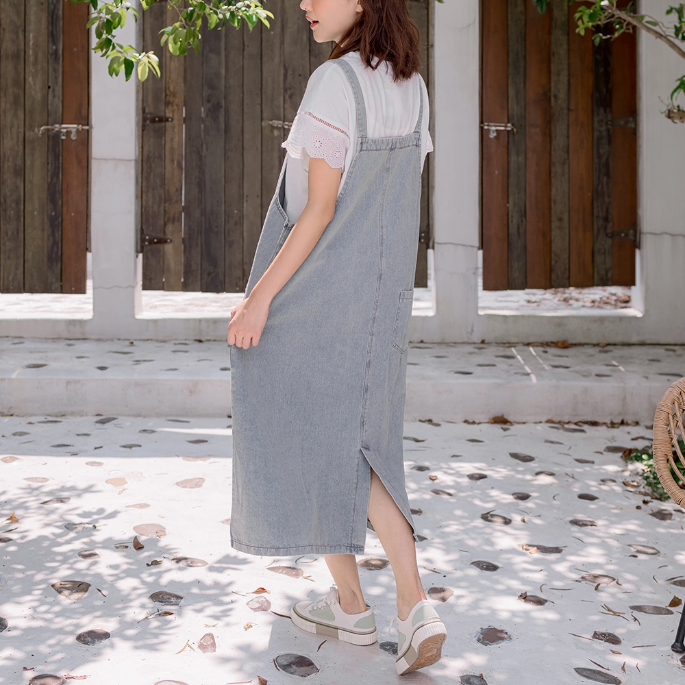 【棠棠媽咪】不收邊大圓袋牛仔吊帶裙 孕婦裝 復古刷色 後開衩 - 06230020