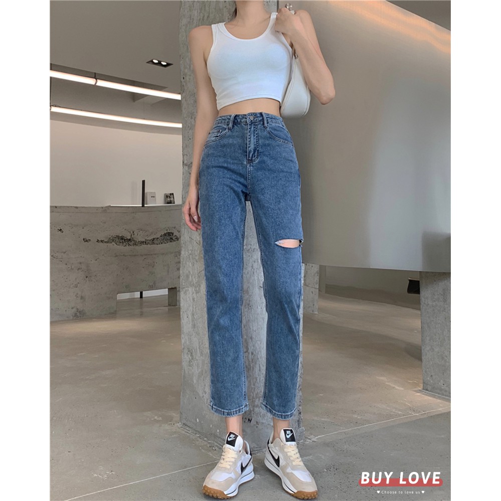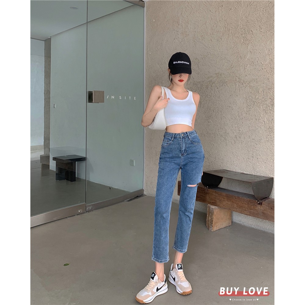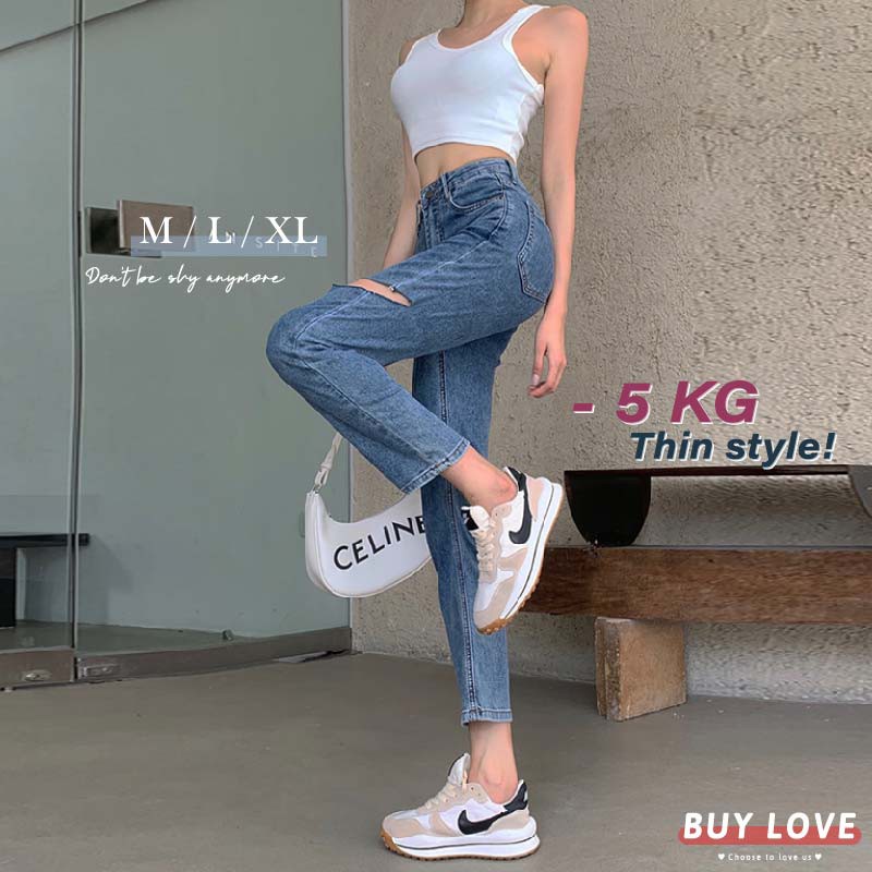 【買到戀愛】限量 多碼微彈高腰破洞拼色九分牛仔褲 長褲 窄管褲 老爺褲【HL0158】