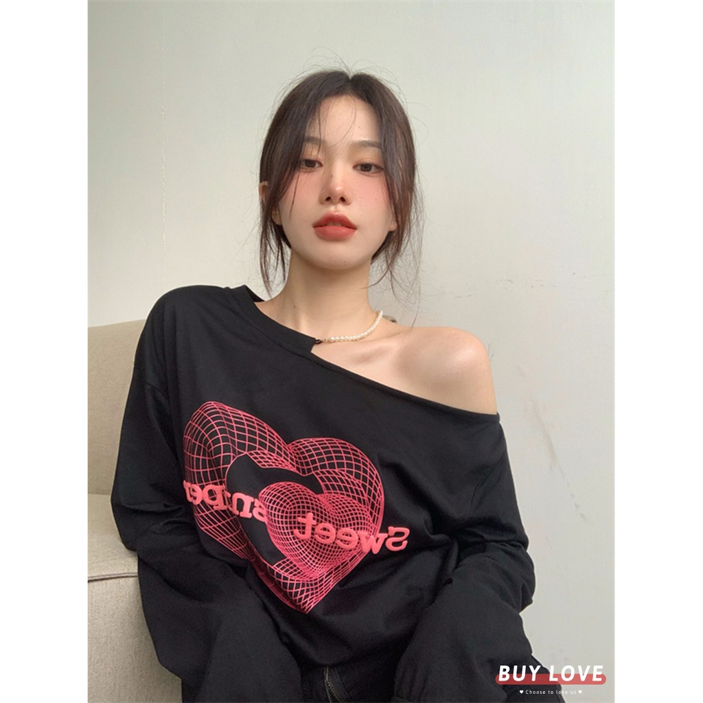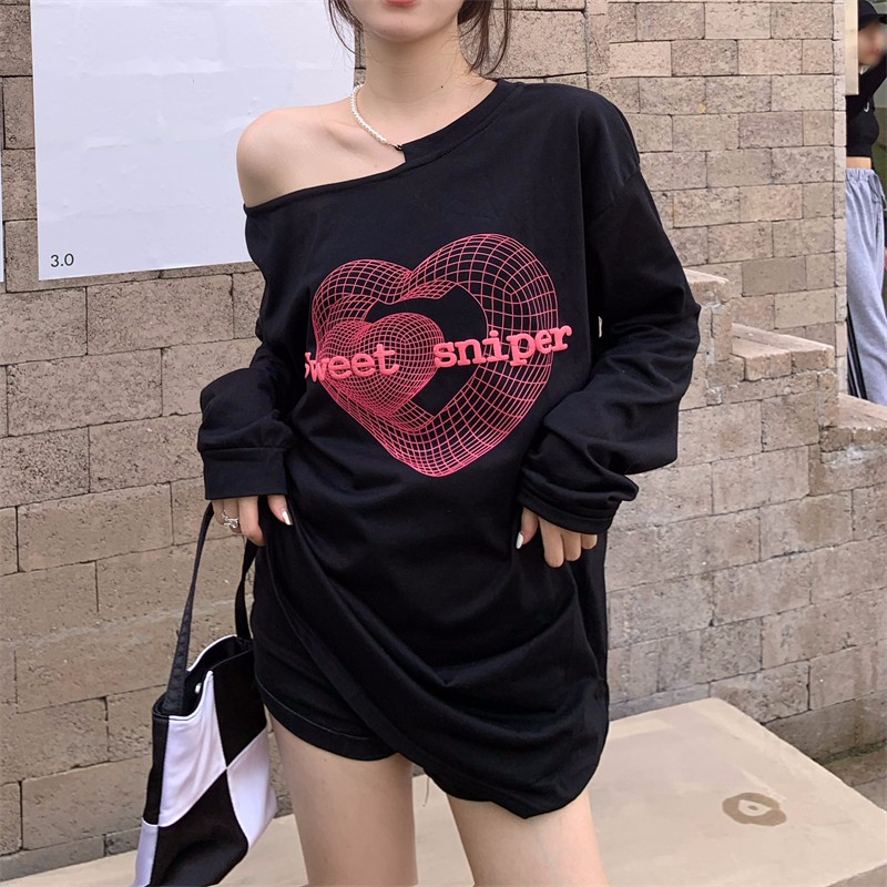 【買到戀愛】現貨出清 性感珍珠大斜肩愛心印花長版薄長袖 T恤 【G88061】
