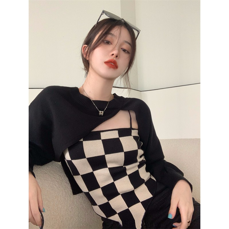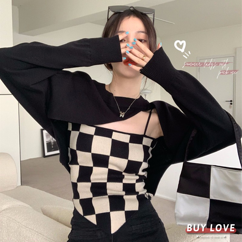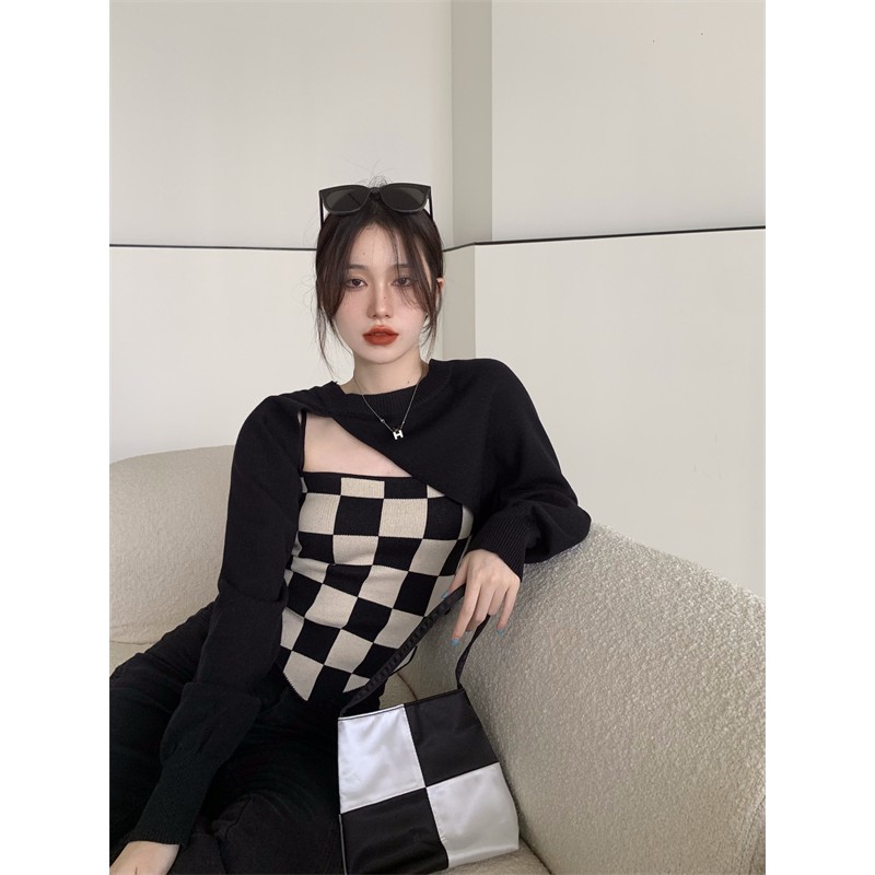 【買到戀愛】現貨出清 實拍設計感長袖短款罩衫上衣棋盤格子背心【G88128】
